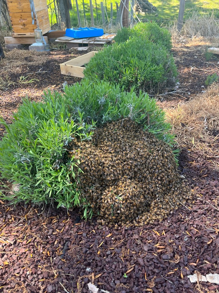 The bees are helping us out. We had just purchased two more used hives with miscellaneous bee working tools and ordered a second full hive kit. I had just assembled the new hive and we were deciding where to store all of the stuff when Mr Rainman spotted a bee swarm. We were outside working and the bees started to swarm and he came over and asked me what was going on. They are very loud and become a cloud of bees before they settle down onto something. They ended up in a tree on an old magpie nest. Way too high to mess with trying to catch them. I thought it was a missed opportunity. About an hour later Mr Rainman spotted them all massed up on one of our lavender plants! It was one of the grey plants that have not yet started to green up but they were inside the bush.