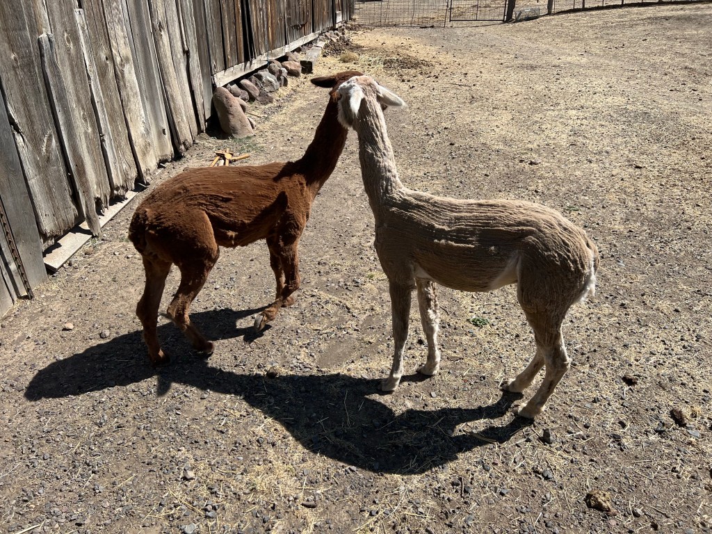 Once The Apprentice messaged me I headed out to get ready. The third manure spreader needed to be unloaded so I picked it off of the trailer with the tractor and put it next to the other two. We flipped gates and got everything ready to push the alpaca up toward the barn. We walked down and I fed apple slices to the three Musketeers and Snoop on the way to the barn and The Apprentice walked behind them encouraging them to follow. Once we got them into the barn lot we snagged one and let the games begin. They are so painful to shear. I had to use two blades for each alpaca. I really needed three blades. I think if we had done them earlier in the year there would not have been as much grit, dirt and rocks at the base of the hair. This would have made the blades last longer.
