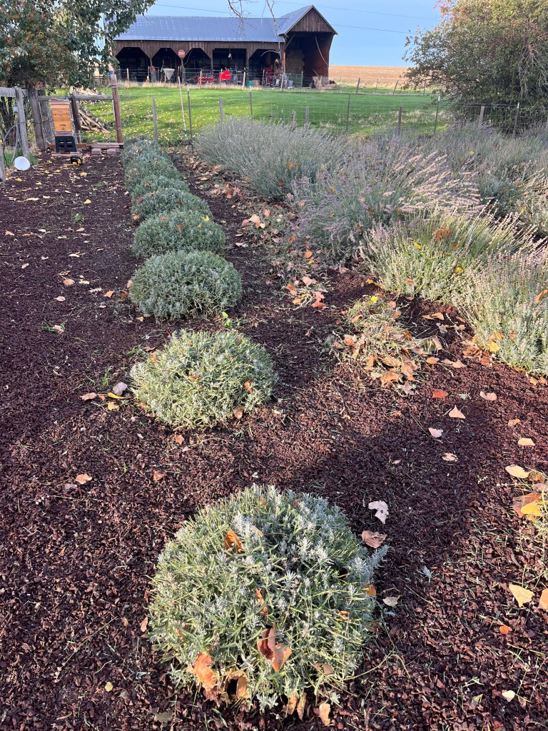 It was still dark outside so we did a light check in the barn, our first one when it was actually dark! The lights are amazing and are going to make things very easy this winter. We tried to just push all the sheep to one end of the barn then I wade in and snag all of the boys. I did this four times and we could not find the fifth boy. The stupid rams kept trying to mount the pregnant ewes so we decided to pull them off, it was time anyways. We have two rams and 40 pregnant ewes and four whethers, not five. The coyotes ate our lamb, we had the other four sold. I dropped off the lambs without any difficulties and Mr Rainman spent the day winterizing the watering system and trimmed the lavender.