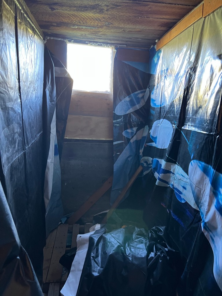 We unwrapped the old billboard vinyl sign I purchased and attempted to get it on the walls and floor of the space. We got it about 80% installed before we needed to go get the freezer moved and filled again. The vinyl is 6 mil and was not very expensive, a 14×44’ sign was only $125. The idea is to line the entire inside of the room with vinyl and with the new metal screen over the window opening I think we can get to a fairly bug free storage area for all of the bee hive extras. We are going to use the metal hanging shelve holders as a way to put our frames up on the wall and hanging free. I think Mr Rainman and I can finish the room in one more day and then we can fill it up with all of the supplies.