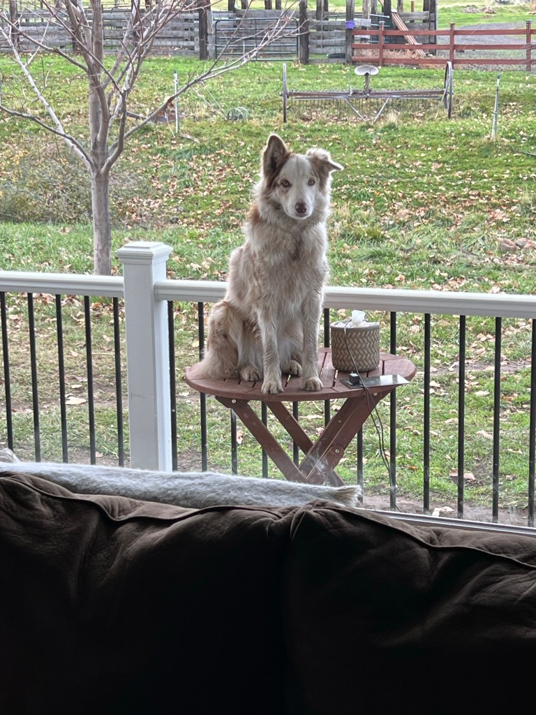 The puppy has no fear and will crawl up onto anything. Her latest trick is to sleep on top of the table to either look over the porch railing or into the large window staring at us in the living room. She currently has the cone of shame on for licking a spot bare on her side. She hates the cone but has finally learned to walk around in it. The only down side is she just pounds into things with the cone, so you have to be careful if she sneaks up behind you so she doesn’t knock you down.