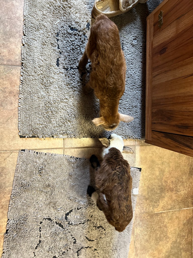 We had a ewe up and die on us. She was one of our older ewes. She had twins and they are both very healthy. I brought them into the house and spent 1.5 hours getting them to take a bottle. I am not very good at bottle feeding lambs. I usually let Annmarie do that and I take care of the barn animals but she had to go to work and it was my day off. I was going to go into work late to catch up so I had the time to give them both a boost. Once they had a couple of ounces of formula into their tummies they became quite insistent on getting more. I had to keep switching between lambs so no one had to do without for very long.