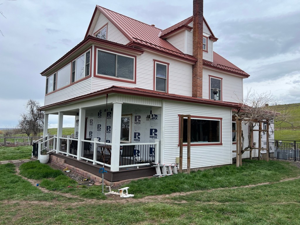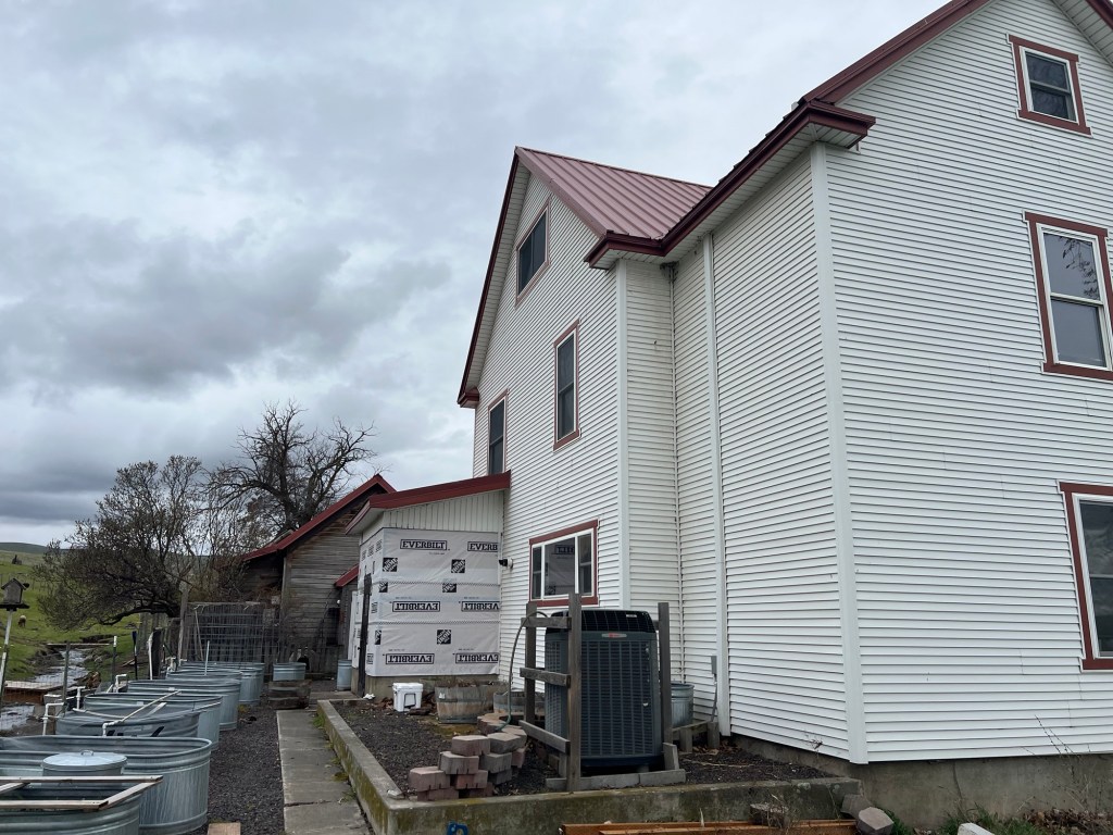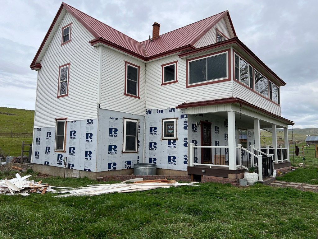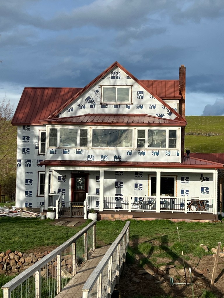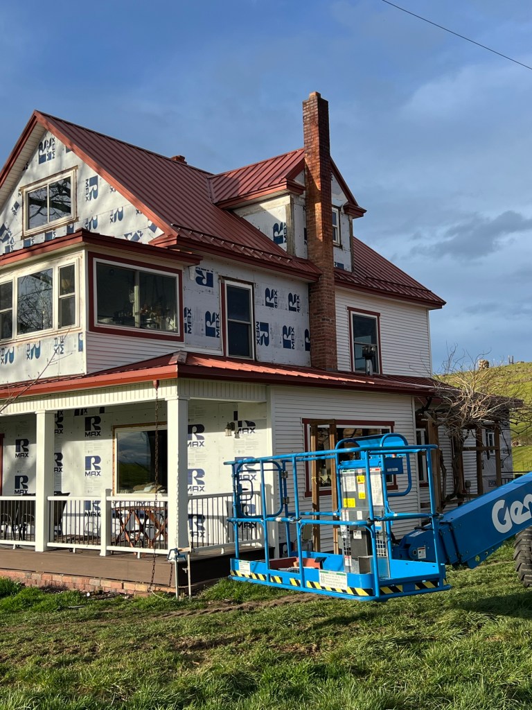 Well the contractor did their part and came out and started tearing up the house. They had the siding off in a week. The 60’ boom truck is a little rough on the yard as it sinks in as it moves and the tracks are about 4” lower than the surrounding yard. This works well for Annmarie as she wanted to redo the front yard anyways and this will just move that project up on the timeline. The nice thing is the gate can stay closed so we have not had to move the dogs. They just harass the worker to throw the ball for them. The problem with that is they never get tired and would keep that up all day long. We are installing LP SmartSide siding on the house. We need to have to not paint before we die in 30-40 years and it looks good and is durable. This will be the test. I was able to drive by a house and see it before choosing this contractor. I really liked the final product and I think it will look very good on our home. For the price I sure hope so, but anyone who has had to hire a contractor recently knows they are very expensive. My advice to you is to do your due diligence and find someone who is very reliable and does good work. Don’t skimp out, get it done right the first time. Because paying for it twice or to get it repaired will cost more than doing it right the first time.