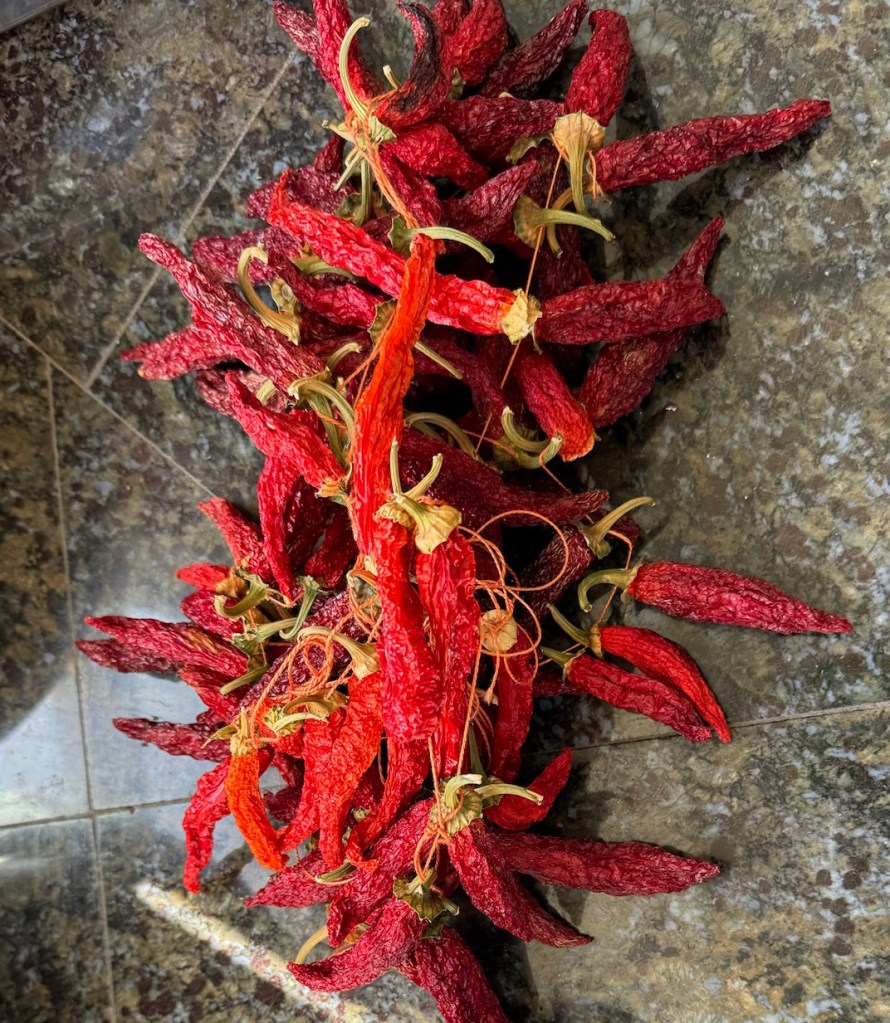 I picked up and then realized that I needed to do something with those hot peppers that I had dried over the winter on the breeze porch. They felt dry and had been up there for eight months so I figured I could just use a mortar and pestle to grind them up. Nope, they were not crunchy dry. So I broke out the food processor, broke them off their stems and filled the entire food processor. I fired that bad boy up and this fine powder started to leak out everywhere. My nose started to run and my voice started to change. I had some big chunks around 1/4” that would not break up so I poured all of the powder and chunks into a quart jar with a screen lid. We have those for growing sprouts.