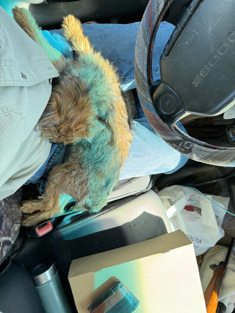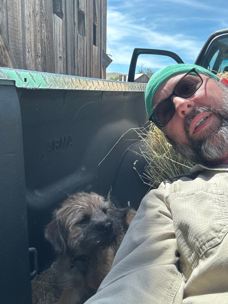 The Go Getter, Mr Rainman and the former Gimp, now called the Mermaid volunteered to help me bring in bales. (The Gimp made an argument for a name change. Normally, I don’t do name changes for the blog but she was compelling and she stated that a Gimp could not pickup hay and that currently I was the Gimp. It made sense in a convoluted way and she was correct as I was wearing the walking boot not her.) This made me the designated driver but since we were starting first thing in the morning and I could only use one foot to operate the gas and brake simultaneously the first trip was a little jerky jerky and I killed it about ten times before the engine warmed up and I did not have to keep my foot on the gas 100% of the time. We managed to pickup four loads (by we, I mean that the puppy, Milo, and I watched while everyone else did the hard work). It was a Friday so he had to come with me so the siding guy could use the boom without fear of driving over the puppy.