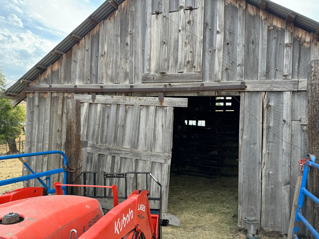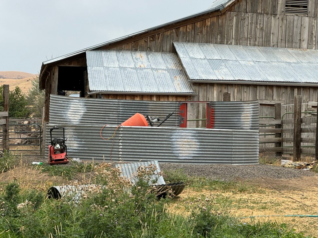 Mr Rainman came over Friday morning and we got the three panels up on the high back wall. It was a battle to get them bent into shape, another problem with not putting them back on in the exact order they were removed. I put up the last three rings myself with the Kubota being my trusty partner. At no point did I fall. I did tear my finger away from one of my fingernails enough to make it bleed and discovered a metal sliver in my finger this morning. The bolts had to be put on between the panel and the wooden support posts and this was an incredibly tight fit. Putting the posts 1/2” from the metal and then adding bolts meant some of the bolts are touching the posts. This is a good thing when I screwed in the lag bolt anchors.