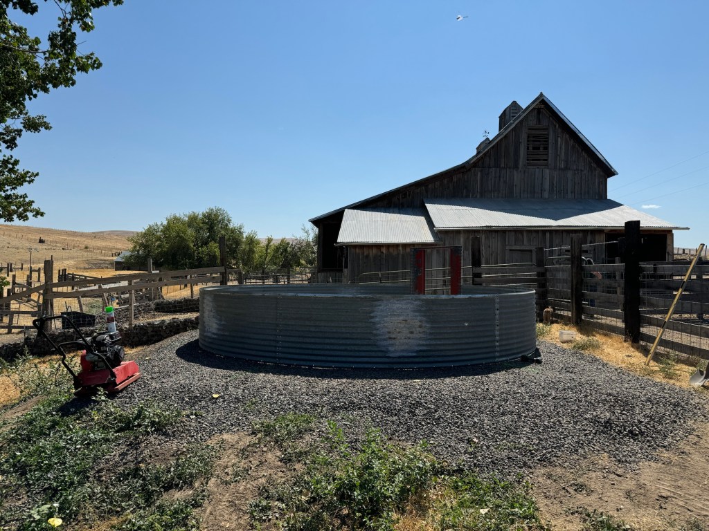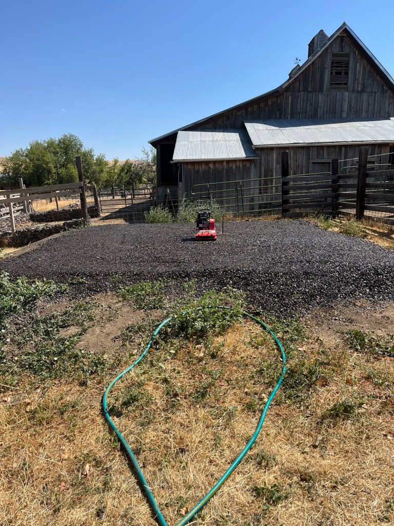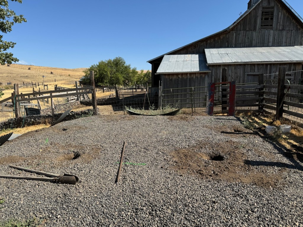 Mr Rainman was able to finally get the dirt/gravel pad all compacted down nicely so we could start figuring out where to place the grain bin/gazebo. I started setting up the first row of walls to get a decent orientation on how it was going to fit. Once I had it bolted together then Annmarie and I went out and we discussed where the support beams would be located and how much of the walls I was going to remove to create an open type building. It turns out that it takes six panels to make a full circle. We are going to take out two panels on one side to create the entrance. They only sent us enough panels to go three high but that is only eight feet high and they told us we had enough panels to go ten feet high. So to compensate we are going to take the four panels from the opening and raise up the other four panels another 32”! This will get us 10’ 8” instead but that will give us enough clearing above the posts to bolt in the ceiling.