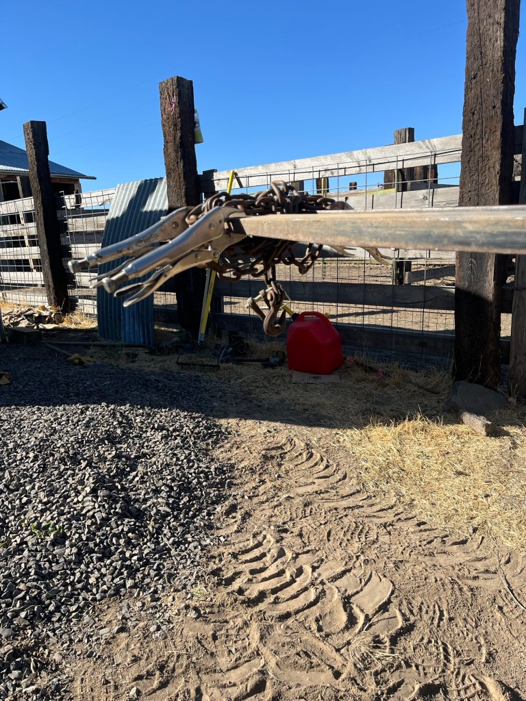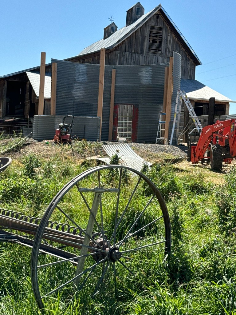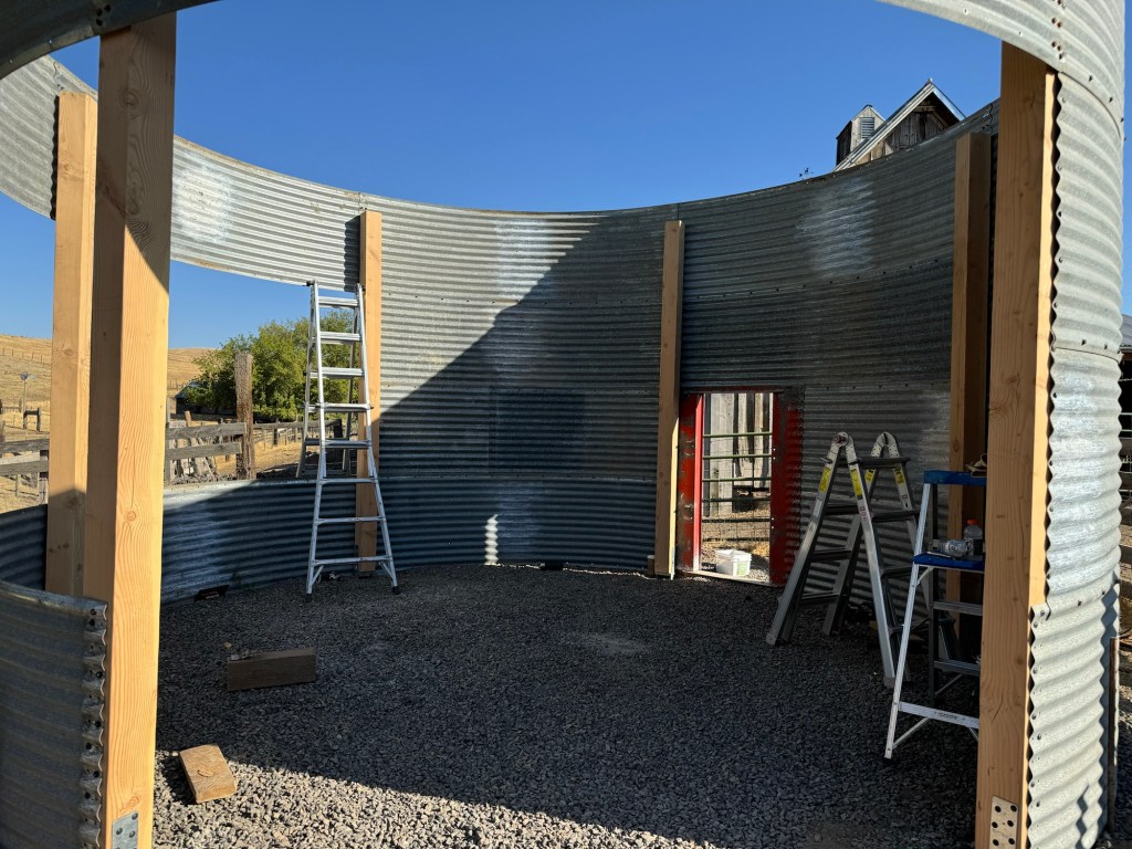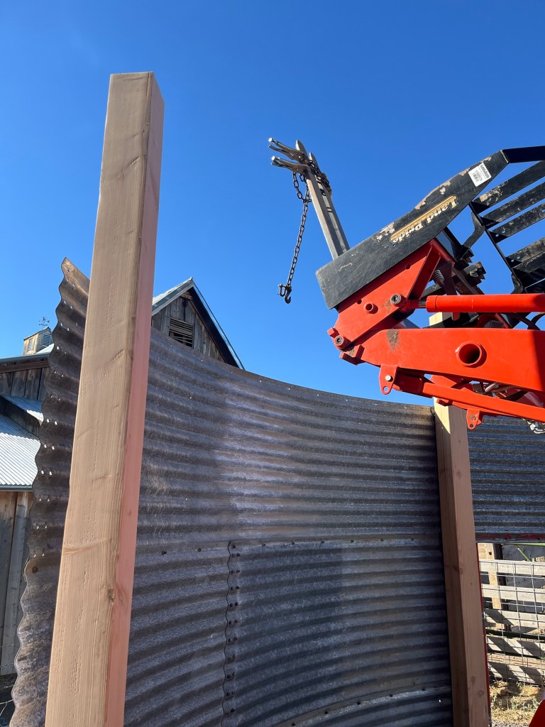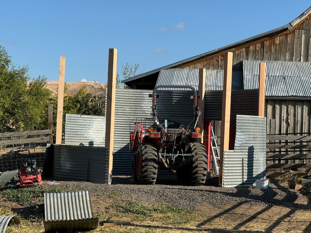 Mr Rainman came over Friday morning and we got the three panels up on the high back wall. It was a battle to get them bent into shape, another problem with not putting them back on in the exact order they were removed. I put up the last three rings myself with the Kubota being my trusty partner. At no point did I fall. I did tear my finger away from one of my fingernails enough to make it bleed and discovered a metal sliver in my finger this morning. The bolts had to be put on between the panel and the wooden support posts and this was an incredibly tight fit. Putting the posts 1/2” from the metal and then adding bolts meant some of the bolts are touching the posts. This is a good thing when I screwed in the lag bolt anchors.