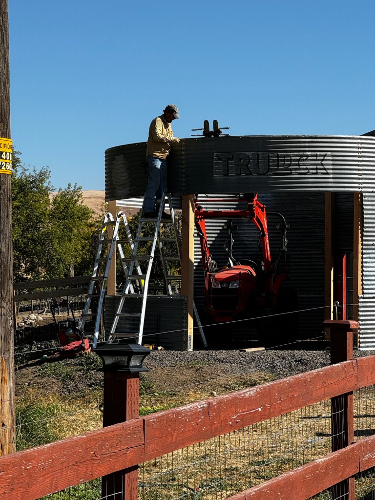 This morning I decided to do a little research on how to put the roof together. Yeah, I was better off not knowing. They used a crane, built the roof and then stood on the ground and proceeded to add a row of panels and lift up the entire grain bin as they built it. No ladders needed! The only drawback for me is that I don’t own a crane. Instead we used the trusty Kubota with the forks on it, a chain and some Vice-grips to hold the chain at the far end of the forks. This worked to get the third and fourth row in place. The fourth row was the worst. We ended up having to drill out three holes that we just could not get lined up, they were off by about 1/8” and the entire rest of the panel was already bolted together.