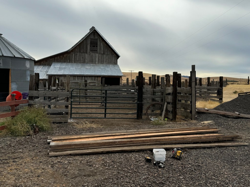 Nope, I let the sheep out of the barn and promptly got the tractor to pick up all the lumber needed to fix the corral. I am unsure if it was out of frustration and the desire to not repeat the experience or just leftover anger at having to chase the cows for an hour and a half! I picked up the last of the 2×8 rough cut tamarack boards I had purchased years ago for building Alcatraz. We had them and some 1x12x16’ boards stored in Alcatraz on the old concrete granary foundation. I need to dig a little more dirt out of the foundation. The damn rockchucks have been digging and living under the board pile. So they kicked up dirt and caused a couple of the bottom boards to rot. But for the most part the lumber is in good enough shape to fix the corral. The boards on top are pretty twisted but a heavy duty construction anchor bolt straightens that right out. I used the rest of the lag screws leftover from the Gazebo. I had bought a bucket of 500, half were used on the Gazebo and a quarter were used on the corral. I had a box of 50 six inch lags that I had to also use on the corral as some of the locations needed a longer screw to get to the good wood. I was only going to do a little bit of the corral but the longer I did it the further I needed to get to completion. I used every single board I had and the last one had to be spliced together, there was just enough.