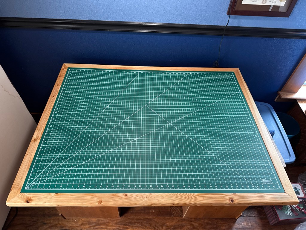 I did the wife’s new cutting table first thing this weekend. She wanted me to make something that was recessed and framed so her cutting mat could just drop in and it would not slide around. It had to be smooth so that it would not snag her fabric that was being worked on. I was able to cut grooves in some three 2x4s and then sand them all smooth. I then cut four pieces with angles and used my fancy tool to drill in recessed pilot holes in the corners so I was able to screw the corners together and then screw down the plywood. It is going nowhere. Once I had it all together I hit the corners again with a sander to smooth everything out. She was happy.