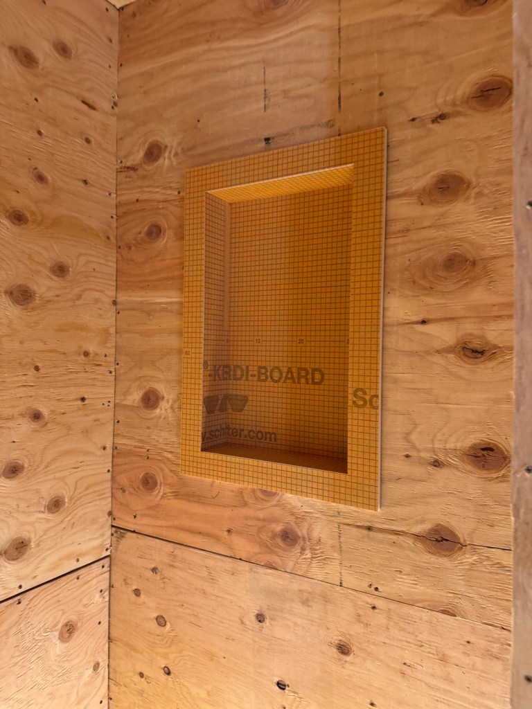 I was flying solo yesterday as Mr Rainman had a birthday to celebrate. I was staring at the walls and deciding where to start with the Kerdi-board install when it dawned on me that so far nothing has really worked out easily for me. So maybe I better check the niche rough openings just for shits and giggles. The box says that they are 12×20” niches. So we made the rough openings 12.25×20.25”, so there was a little adjustment room. The box lied. They are more like 12.75×20.75”! I started looking at the plywood hard to see how much I would have to remove to get to the internal cross pieces I had installed to stiffen the niche area. I recognize that Schluter said I did not have to do this, but with all the other reinforcement I had to do on the bathroom walls I just tossed this in as a bonus. I ended up needing to cut out a small section through the edge of a 2×4. The oscillating saw was the only tool I have that would go deep enough and not tear up the back wall also.