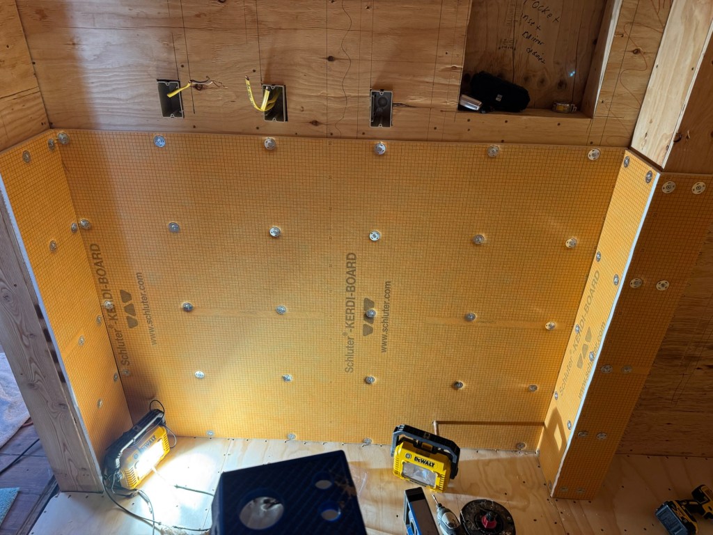 The Kerdi-board is very easy to install. I have been super impressed so far. I started on the easy section of the bathroom. It is really easy to cut with just a razor knife and the lines painted on it make it easy to freehand the cut. As I was installing the special washers it dawned on me that I did not have enough washers and screws. They did the calculations for a washer every twelve inches but when doing small sections you still need two washers.
