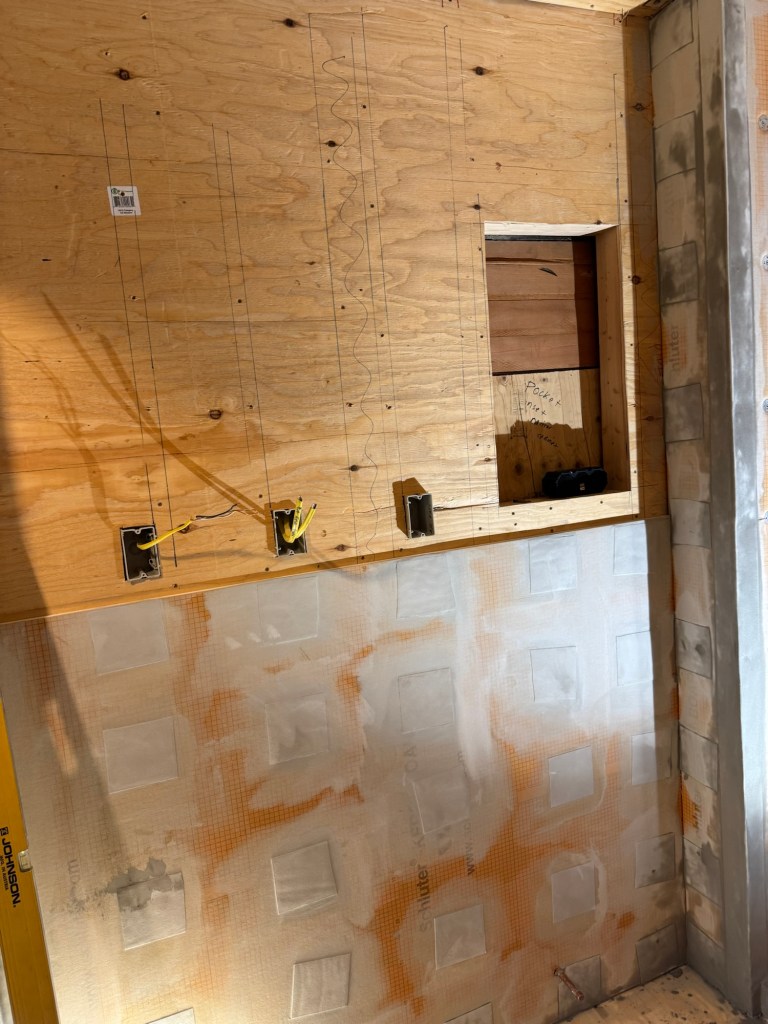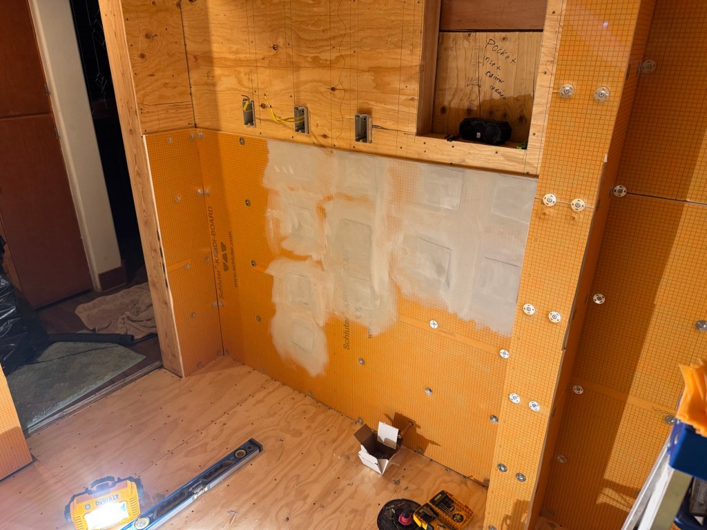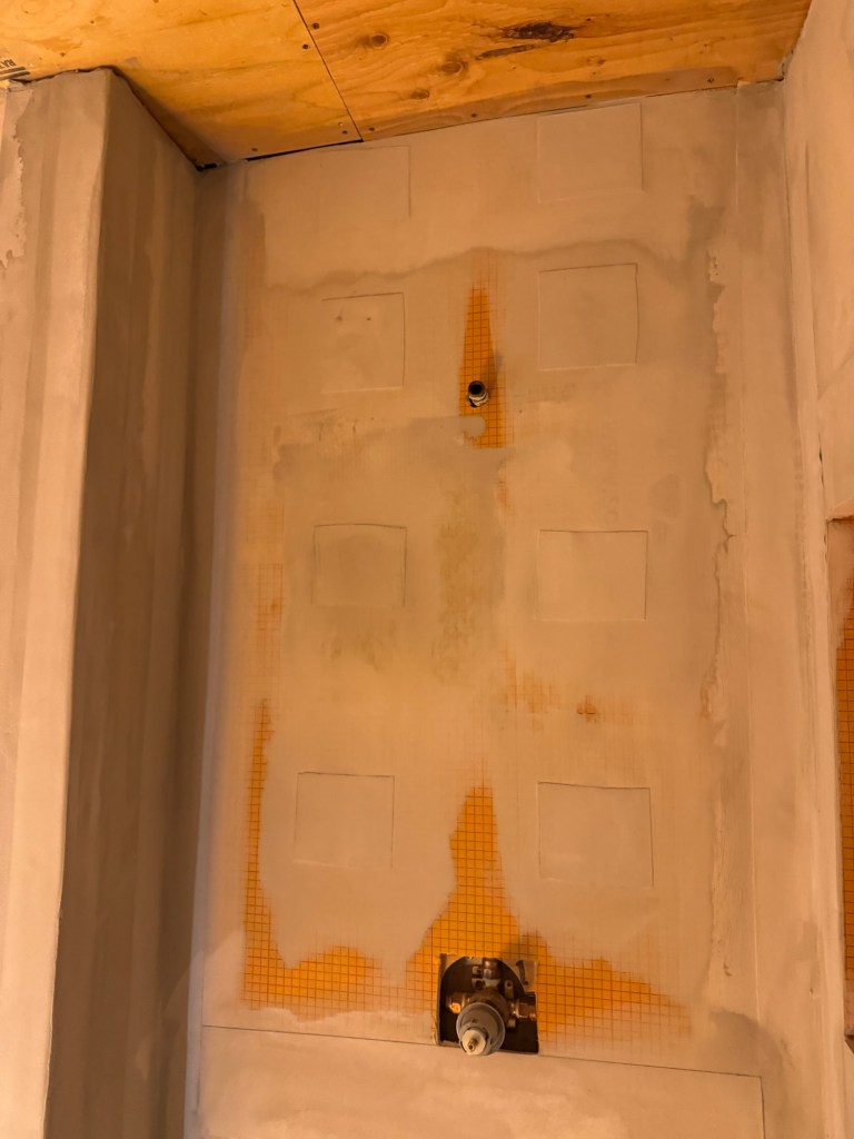 Well the weekend was well spent, the bathroom is almost ready for tile. We just have to install the two membranes in the shower around the nozzle and the handle then seal the Detra membrane seam and Detra to the wall. The shower pan is still pending arrival by this Wednesday. It should not be a holdup for us as we can do the main bathroom floor and then the main bathroom walls first. If the pan is still not here after we get those tiled then we will grout them all next.
