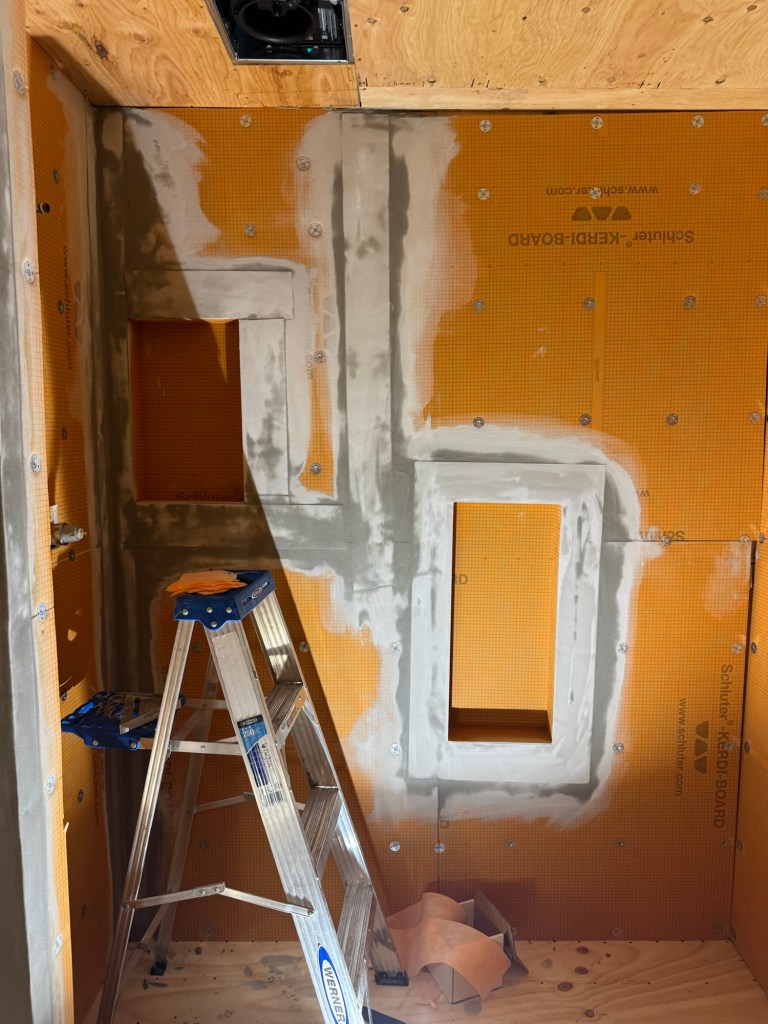 I just need to keep making progress every day. It took two days to get all of the holes and seams sealed correctly to provide that waterproofing that Schluter guarantees. I did not realize how long it was going to take. Mr Rainman asked me if I had read the reviews or not on the Schluter products and I said no. I knew it would do what I wanted but did not want to know about the reviews. He said one of the biggest complaints was on how long the system took to install by people not professionals. After getting this far I would say those reviews are spot on!