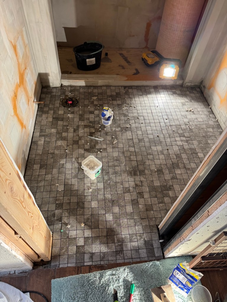 We opted to tile the main floor first as I will be setting the wall tile on the floor tile to hide the lower edges. In the shower I have to actually tile the walls first before I do the floor. It has to do with how the drain is installed. I need to watch that YouTube video again. This entire process has been internet searches and YouTube videos when it comes to the Schluter part. I am super happy with the waterproofing ability of it but man it takes a lot of time to do it correctly if you are not proficient in using it.