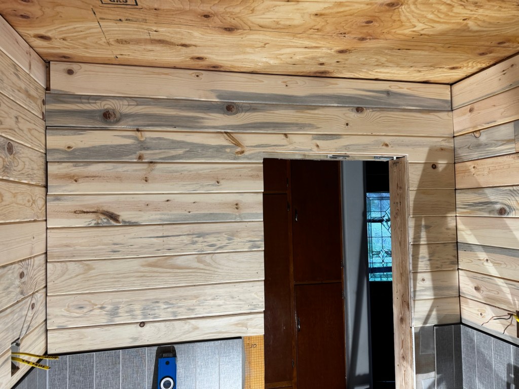 Currently, we are going to live with it for now and see how it goes. That won’t be hard as we are still not using the shower. The bathroom has no ventilation fan, lights or heater. We need to get the wood sealed and the ceiling up before using the shower. Saturday and Sunday I worked on getting the tongue and groove installed on the upper walls. What I did not realize until I was two boards deep was that for some odd reason I had two sizes of tongue and groove boards. The groove and tongue were smaller on one set. Needless to say this was not discovered until I was unable to marry two pieces with a large hammer being involved. I then had to sort out the two types and discovered that I had enough to complete each sidewall in their own type. This meant I only had pieces that did not match to do the end wall. I ended up with a trip to Home Depot to get ten tongue and groove blue pine boards. I had to look through 50 boards to find ten worth buying that did not have horrible cracks or knocked out knot holes. I would recommend waiting a month before going there to buy any.