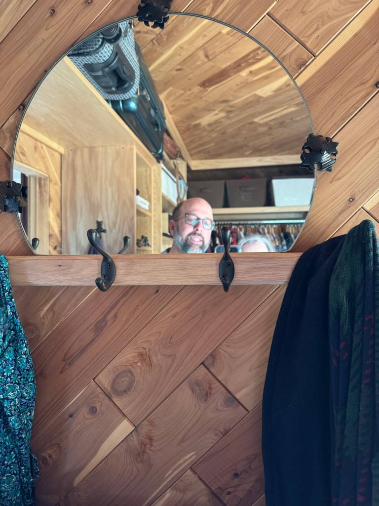 Annmarie and I found a mirror kicking around in the house when we were setting up her sewing room. It used to go on a men’s butler drawer I believe. I had this great idea to install it on the wall in our walk in closet. She told me it was fine but it was not going to do her any good. I got some metal pieces to hold it in place and installed it this weekend.