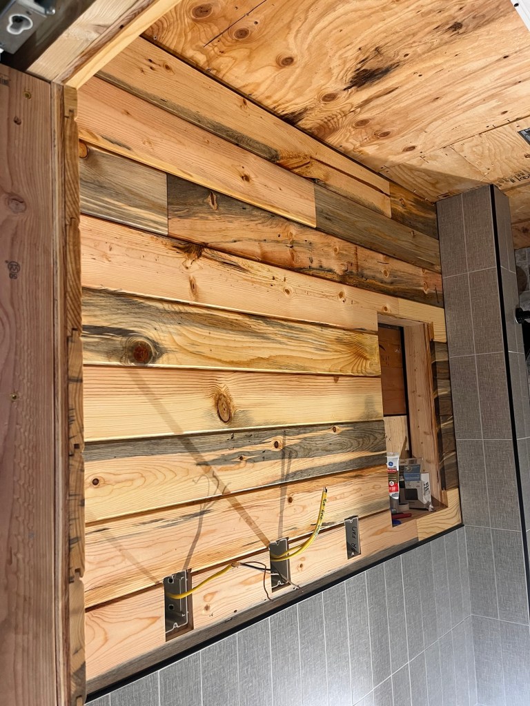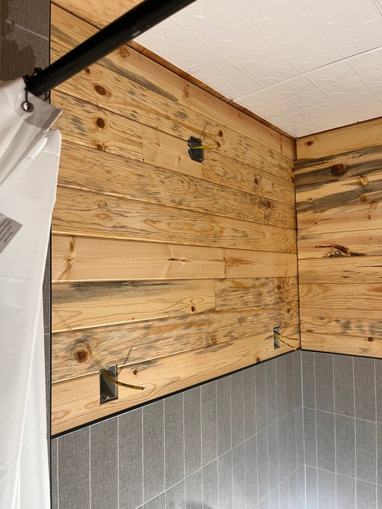 Mr Rainman was able to rub on some Tried & True finish onto the blue pine and it really made it snap. I started on the ceiling one evening and after 1.5 hours realized that I had done it wrong, I had made a gap on the side when one was only needed for the ends. I had to take it all down and do it correctly the second time. This is just the main panels, I will need to get the crown molding on next to marry the ceiling and walls. The crown molding is going to be hard as I will need to be able to drive a nail into the shower grout. I have some diamond drill bits and I think I am going to have to predrill a hole. It will not be fun.