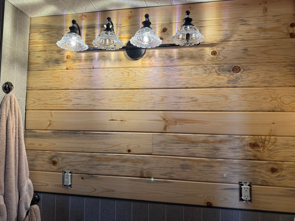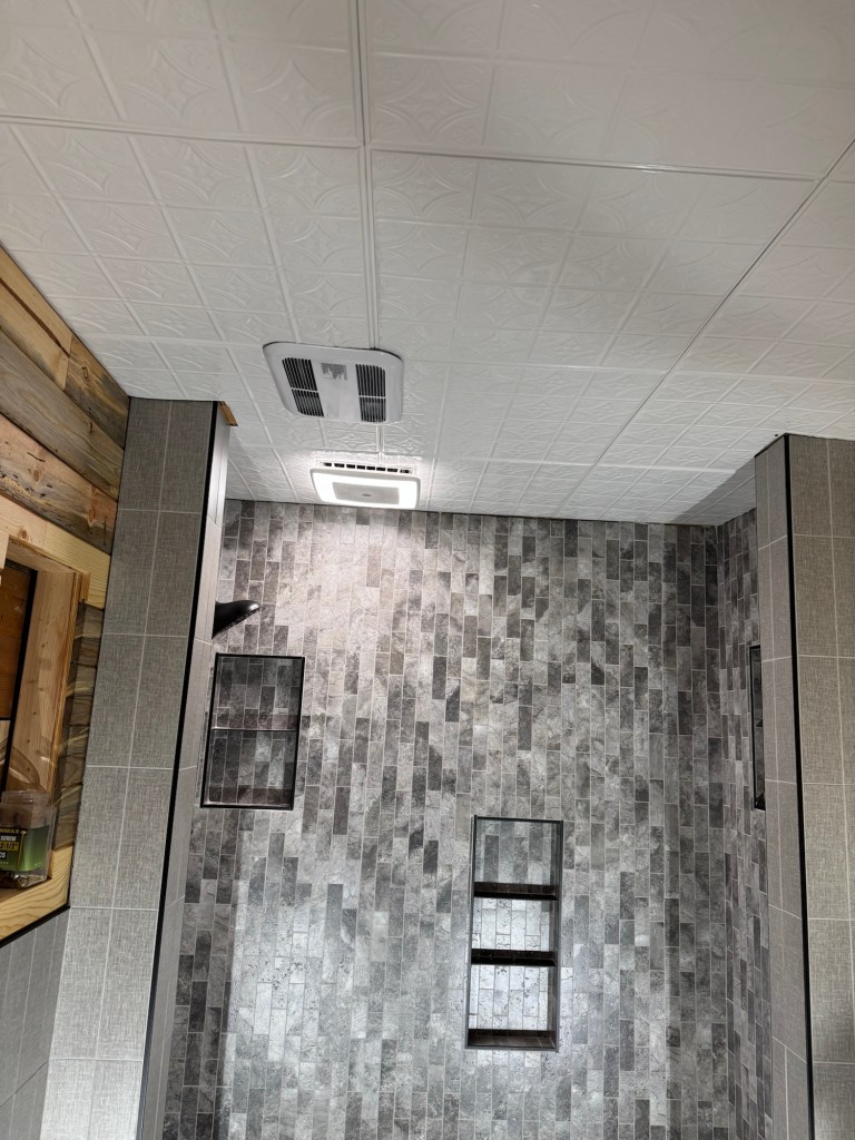 Once I had the ceiling panels in I installed the bathroom light. Of course, when looking at the light I did not check to see what kind of lightbulb it actually uses. It turns out to be some LED with a G9 base. I was only able to find two of them in Pendleton so I ended up ordering more on the internet. It is a little dark in the bathroom, I may end up having to order a brighter light bulb. It may take some trial and error to get the amount of light tuned in. I do really like the light design and the cut glass makes some interesting patterns on the metal ceiling tiles.