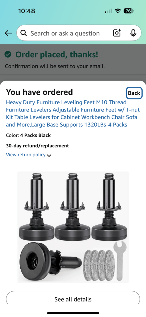 I did manage to run around the house, picking up, roasting coffee, cleaning up floor and doing laundry before I got started in on the bathroom. I opted to work on the vanity first. The crown molding is incredibly tedious and I just was not looking forward to it. Annmarie and I played with the vanity until we found the level spot but the vanity was not sitting right. I realized that I knew it only had three supports on the four legs. So I opted to move one of them from the front leg and put it on the missing back leg. Nope, it was a weird all in one piece that was hammered into the bottom of the leg. It was hollow and had a metal cap on it. Once I started prying on it I had to break it all apart. There were holes drilled in the bottom of each foot for these steel sliders. I had to get the drill out and drill out the hollow metal tubing from all of the holes, even the hole that was missing the top. This means I need something to go inside the bottom legs. I found an adjustable set of furniture elevators that will work. I had to special order them, they should be here next week. Now my excuse for not working on the crown molding was gone. I cannot put the granite top on the vanity until the feet are repaired as I had to tip the vanity up onto its side to get to them.
