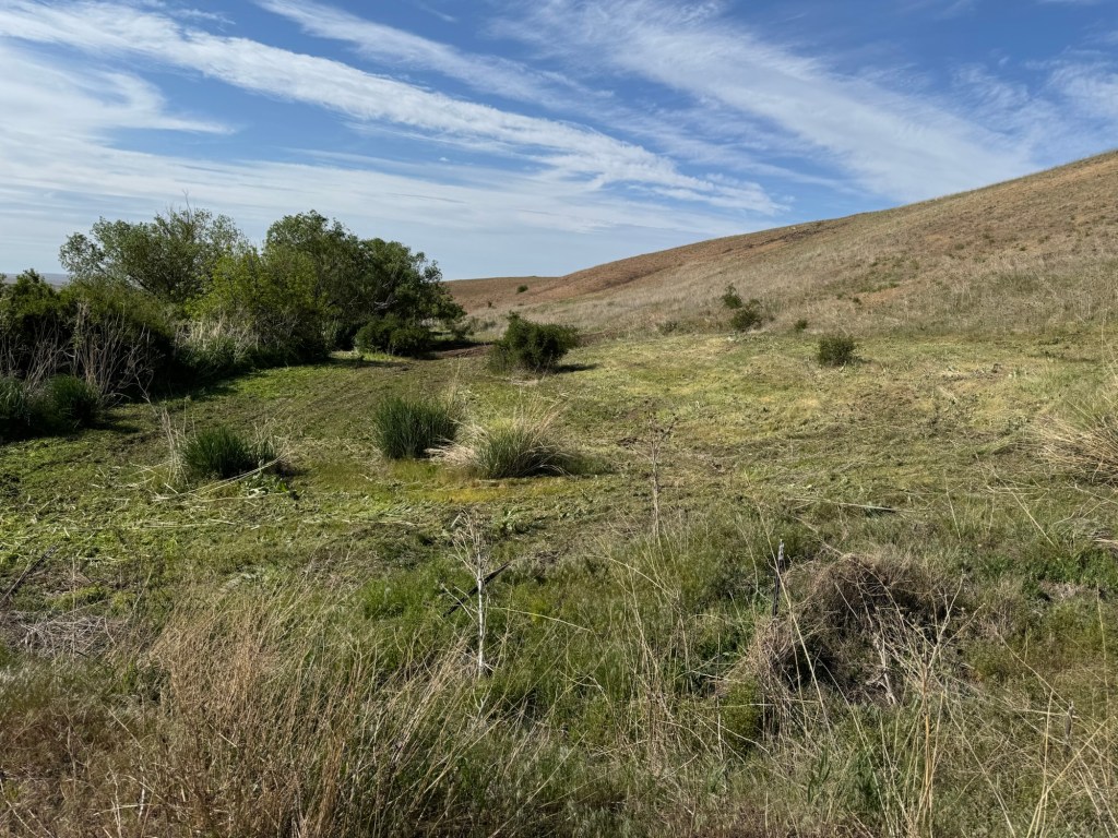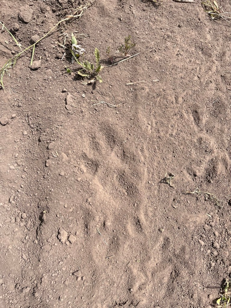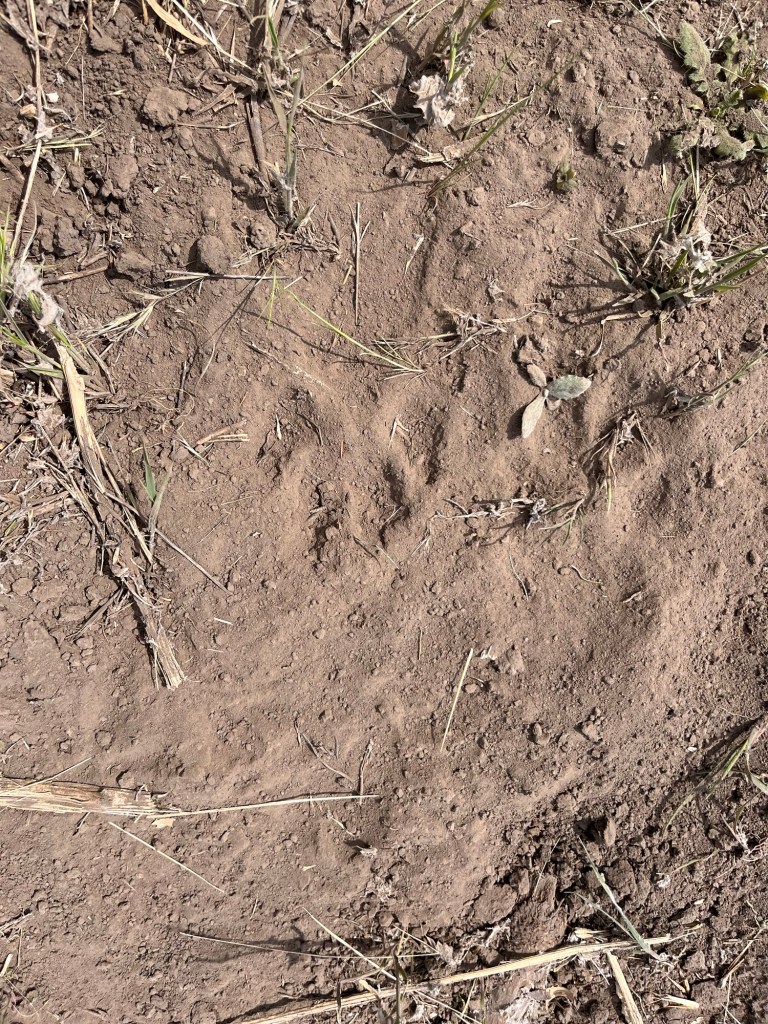 I was able to get down to field one and mow the newly made ditch. Mr Rainman spotted some fresh coyote prints in the mud. We have not seen any yet this season but they are obviously out there. I went to the other side of the creek and worked on getting it mowed down. I managed to get the huge hole filled in! That has been there for over 25 years. Someone buried two huge track backhoes in there and spent three days trying to get them out. They left a huge hole that was never filled in. The edges of the hole were straight walled and over eight feet high. It is not safe to drive the tractor in that area without knowing exactly where you going and where the hole is located. I got the entire thing filled in and now anyone can safely go back there and mow it down as needed. That has been on my list for over 15 years and I just never got around to doing it. Usually, when I wanted to do it the ground was so hard that I could not move the dirt. I even used the little John Deere 2520 to do it.