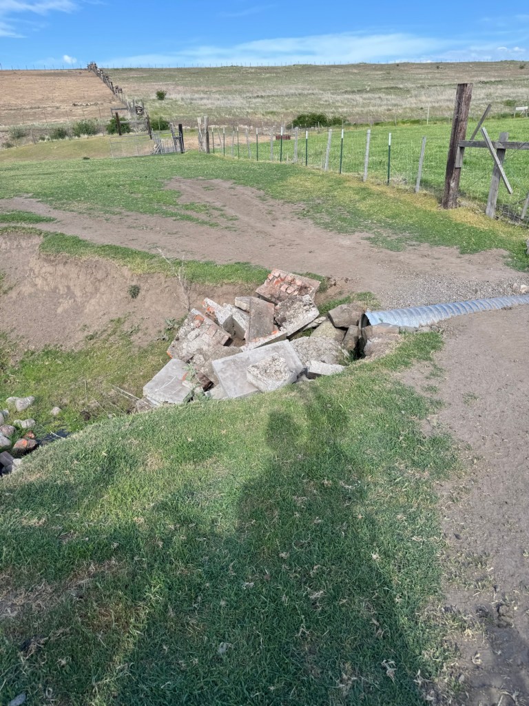 The kids brought down a bunch of concrete from their remodel. We are going to use it to help stabilize the bank. It keeps getting eroded by the seeps, water and sheep. They have at least three more loads and I think that will make a great addition to this corner. We should be able to stop the corner from falling in.