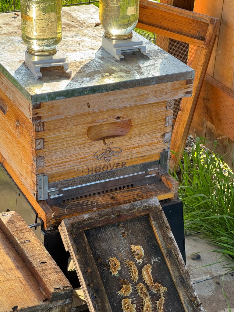 On Thursday night we went and picked up a starter hive of bees and drove them home to their new abode. I unloaded and carried them out to the new bee enclosure and Annmarie suited up and smoked them and moved them into the new hive. They are all in the new hive and after the third day they quit eating the sugar water concentrate we were supplying. I would say they are settled in. Annmarie is going to add another nuc this weekend.