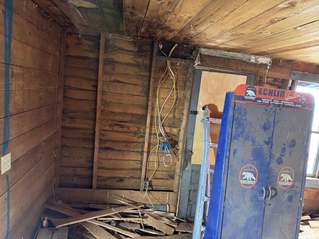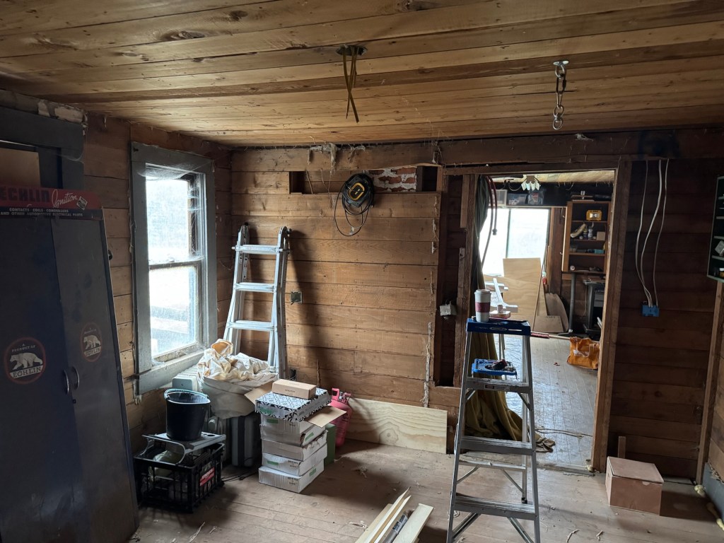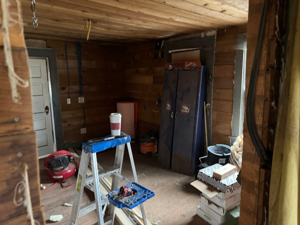 Instead of working the animals I went into the old house and worked on my man cave room! Two of the walls already have insulation and outlets installed. The outside wall and the separating wall to the front room need to be insulated. I think I have some extra insulation up in the attic area that can be brought down to go into the walls. I am trying to keep the costs way down for this room. I am going to use a tarp to cover the entire ceiling. This will keep the dust from falling through the boards and down onto whomever is below. I will caulk the outside cracks to limit the amount of water that gets into the wall. I was able to get about 80% of the boards ripped off the wall. I wanted them off before going under the house and jacking up the middle of the house. The outside door sags by almost an inch and the inside door needs to be widened but it also has a heck of a slant. I want to get that slant out by jacking up the house instead of just squaring the door frame in a crooked opening.