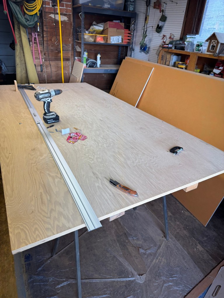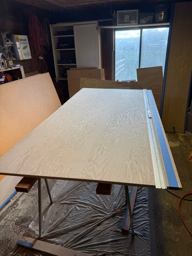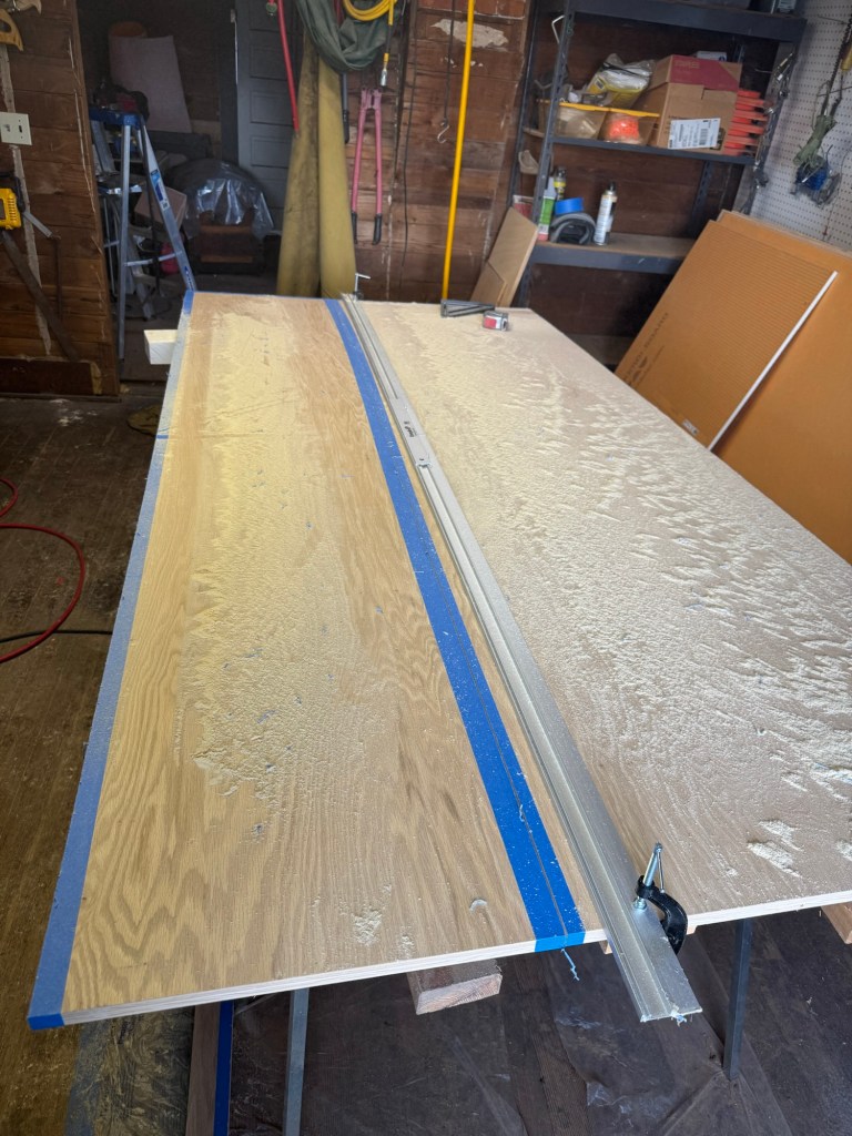 Well it’s that time again, time to actually go back to an old project and try to get it closer to the finish line. The bathroom is totally functional at this point. Never mind that there is no storage or that we cannot hide electronics. The shower has hot water that gets you clean, the sink dispenses water and the toilet flushes, the crucial tasks can be checked off the list. It was going to rain on Sunday so I decided to start in on the custom bathroom cabinet. I bought furniture grade 3/4” oak plywood at a paltry $95/sheet. I was disappointed to learn that it was necessary to trim all of the edges of the plywood to get rid of the damage on the edges. I don’t have a furniture grade table saw so I found this guide rail and put an expensive blade on my DeWalt skilsaw and made the first cut. I then had to go back and tape the edge I wanted to cut and cut through it again to get a clean cut. The first cut still caused some tear out on the laminate.