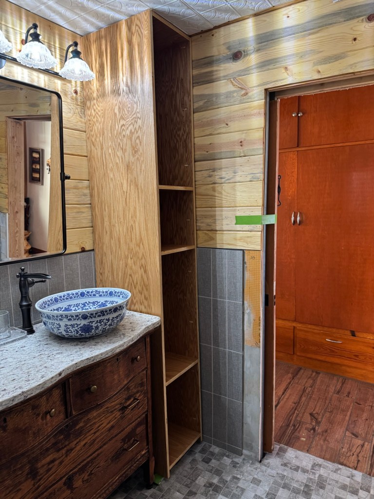When we turned that cabinet on its side to get it into the bathroom, there is about a 1/4” clearance from the ceiling. If I had made the cabinet any taller we would not have been able to stand it up in the bathroom. I would have had to try and shorten the bottom equally. I am not sure that would have gone smoothly as I would not have torn the cabinet apart again to do that.