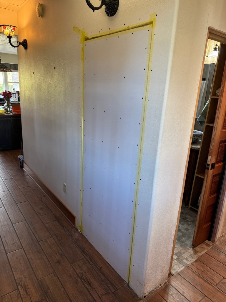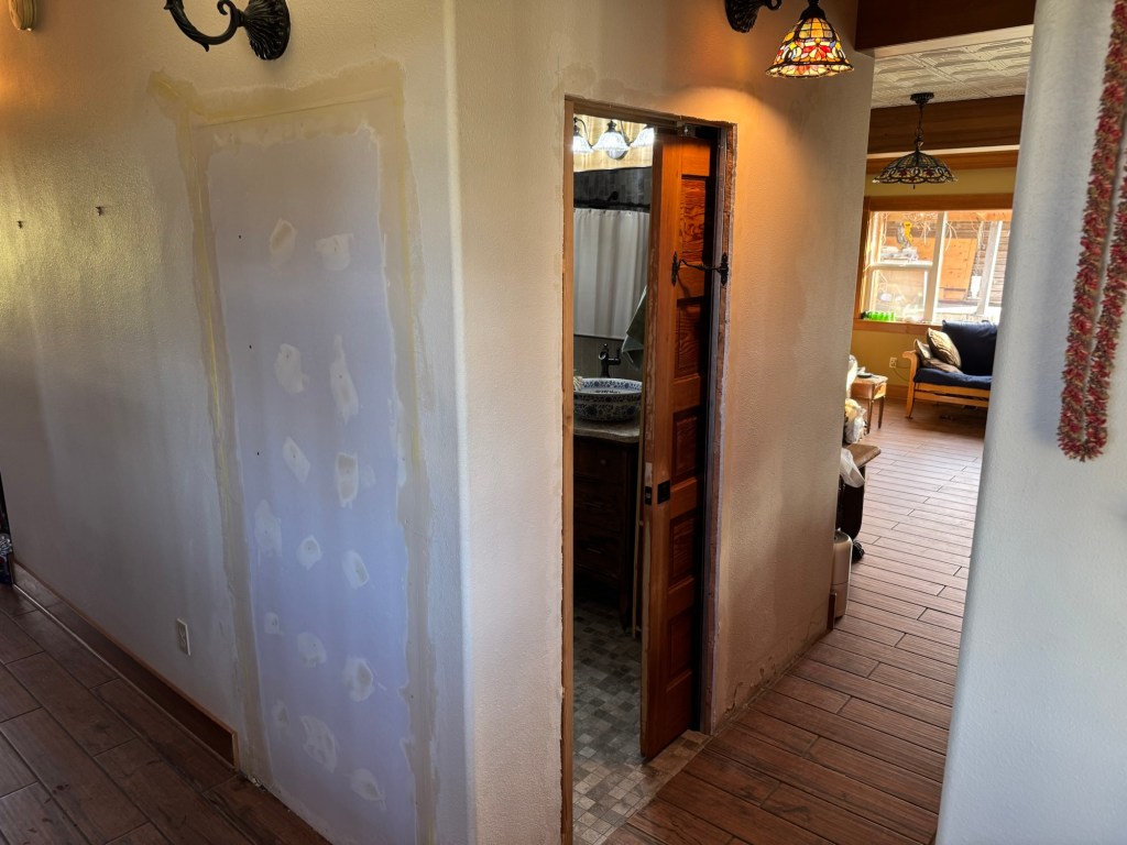 The bathroom deadline is approaching quickly so I have been working on getting it completed. We shimmed out the wall on the inside of the door so it is ready for trim. The entire inside of the bathroom is ready for trim. I need to get the Sheetrock repairs completed so that I can put primer on the wall and get it painted. There is a lot of height difference in some places so I am going to have to build it out with the mud to make it look right. I am not the best sheetrock person but I can muddle through.