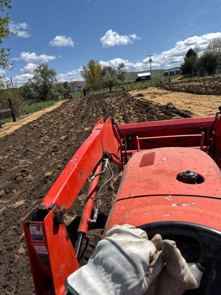 Last weekend was spent going around in circles! We are trying to get about three acres cleared of cheat grass. The stuff has totally taken over the fields and there is nothing left but cheatgrass and thistles. I tried to plant grass about a decade ago without any success. It got choked out by the cheat grass. Our plan is to keep killing the cheat grass until we cut down on the number of seeds in the soil. I will keep spraying Round-up and plowing the field under until we just don’t get much cheatgrass emerging. We got a really good kill on the grass and I was trying out the new plow that the Gingerman brought over. It is an old rotating or flop plow that allows for the direction to be changed. It took a few hours to get the number of pulls on the rope figured out. It cycles through a transport/lower/lower/flip cycle depending on where you are in the rope pull cycle. Plus, there are a couple of springs that need to be replaced. I had to get off and kick the levers every twenty minutes. I do have the springs on our grocery list so I do not forget them. It took me two days to plow, disc and harrow the three acres. When the equipment is only 2-4 feet wide it can take a while!
