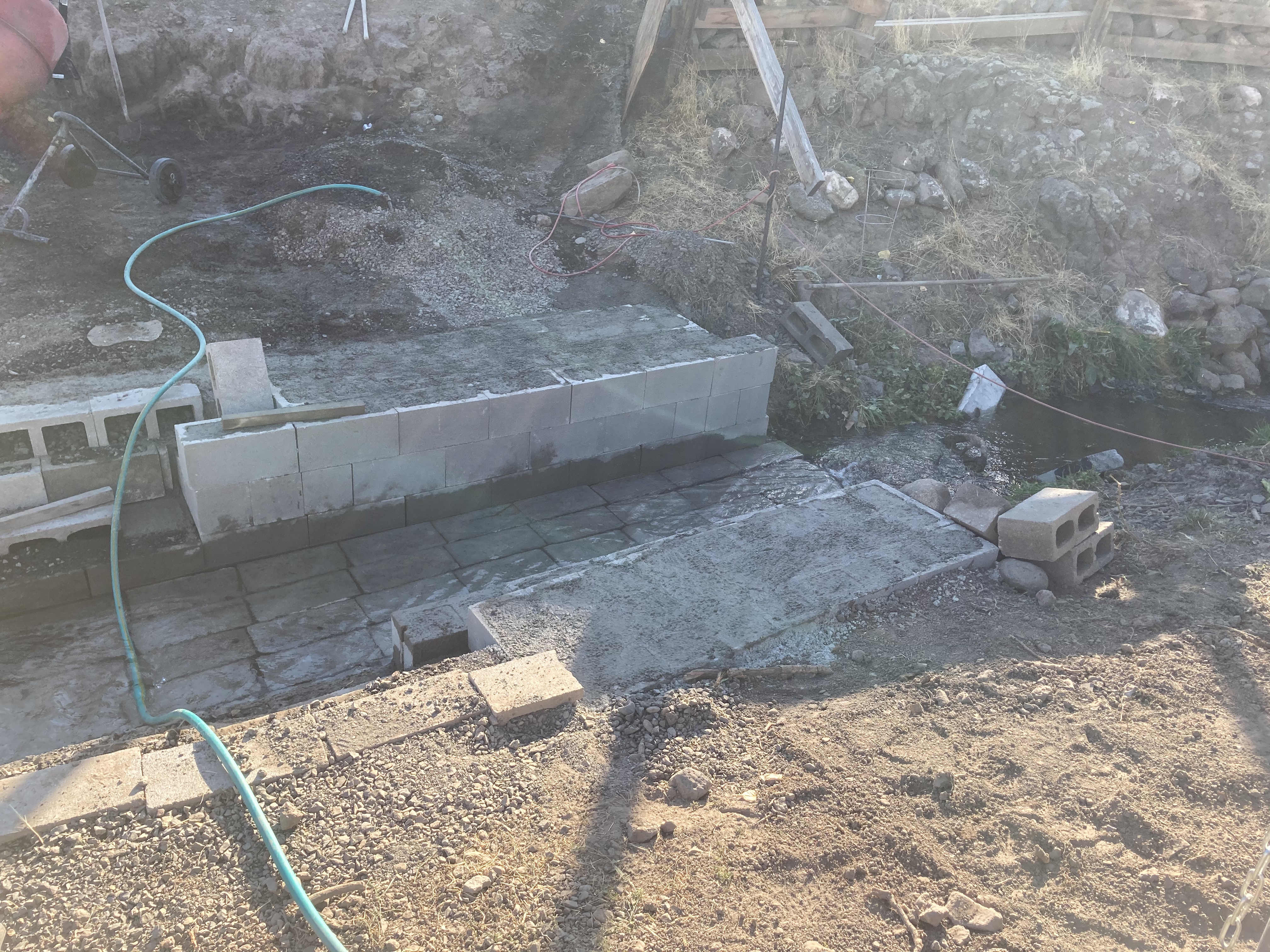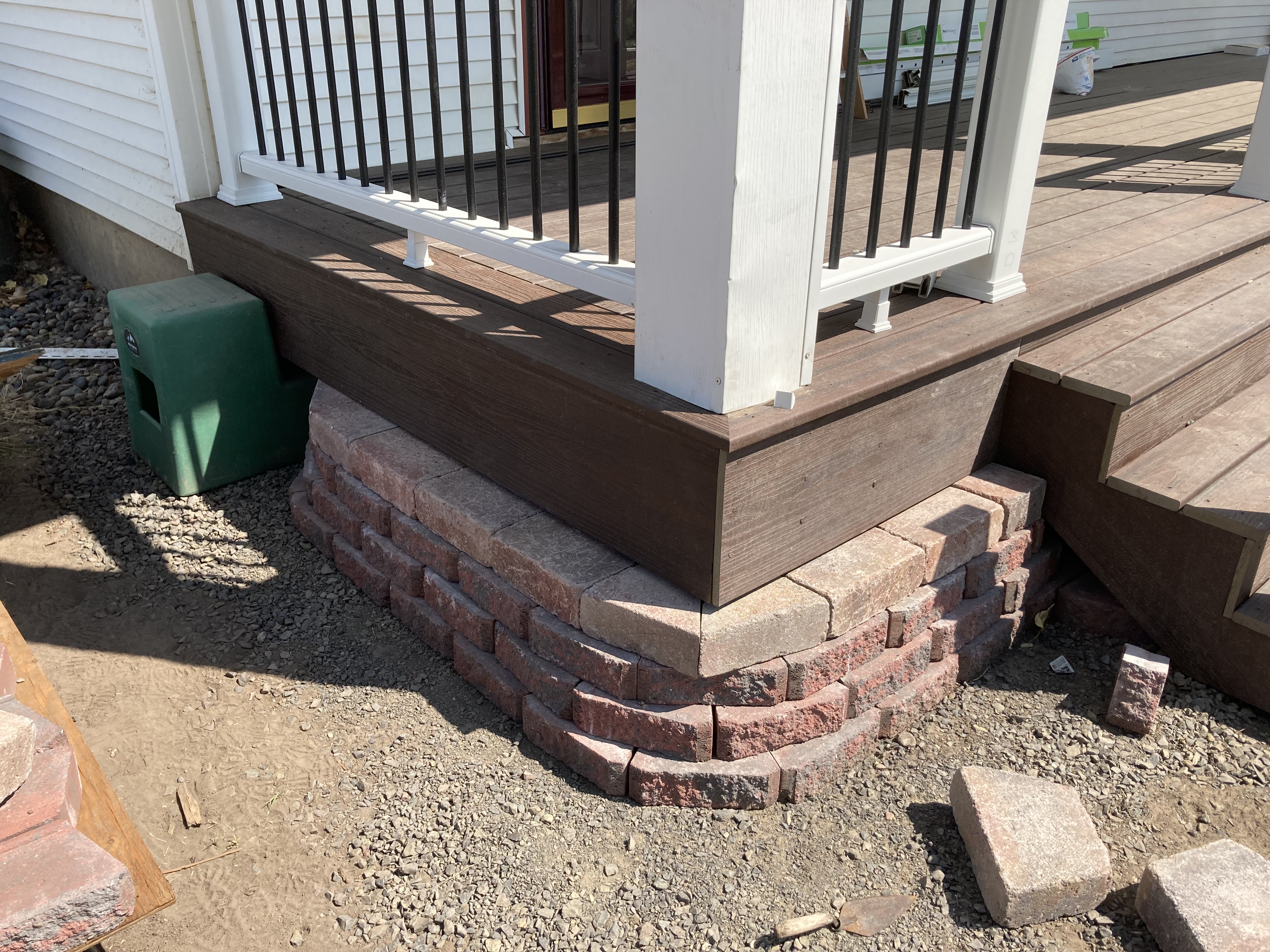 Well we are finally starting to make progress on the finishing touches for the front porch. Mr Professional and Mr Rainman got the blocks installed on Friday. They were having some trouble with the corners getting them to match up and get the cut angles correct. I told them I would get it this weekend. I spent about two hours on Sunday cutting angles with the wet tile saw and then breaking the blocks with a mason’s hammer. I then used a diamond blade to grind the rough edges smooth. I was able to make both corners and ends fit nicely. Annmarie thought I had not had enough water to drink, said my lips looked like I was dying. I had to go inside and look in the mirror, I had concrete dust all over my face and my lips were a pasty white color! I am going to live.