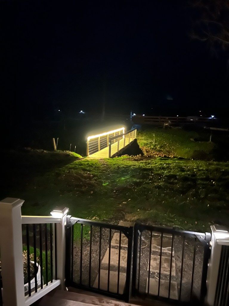 After Thanksgiving we decided that more external light was needed over the bridge. We purchased some rope lights and were going to install one on each railing. The wind and cold meant that Mr Rainman and I only managed to get one side installed before calling it quits. After it got dark I was glad we only had one side installed. One was incredibly bright, I cannot imagine how bright two would be. We are going to see if we can use a Wi-Fi controlled electrical plug to control the bridge light. We can program the plug or turn it on/off with our phones when needed. We have not tried it out to see if the Wi-Fi extends that far out into the yard yet.
