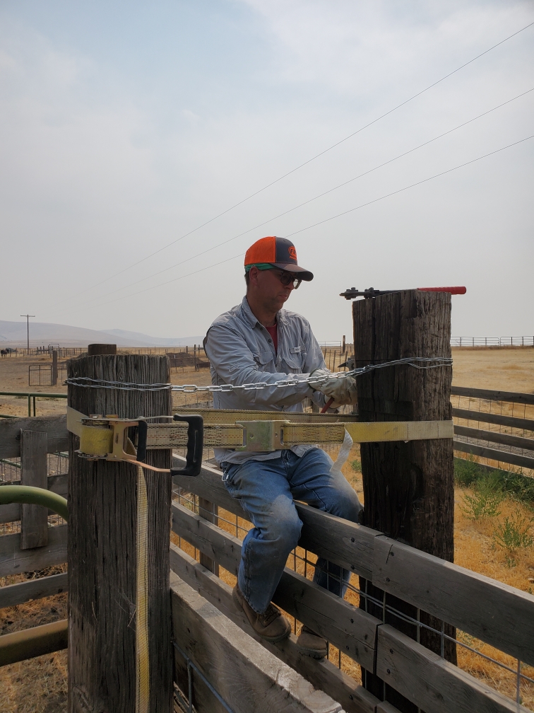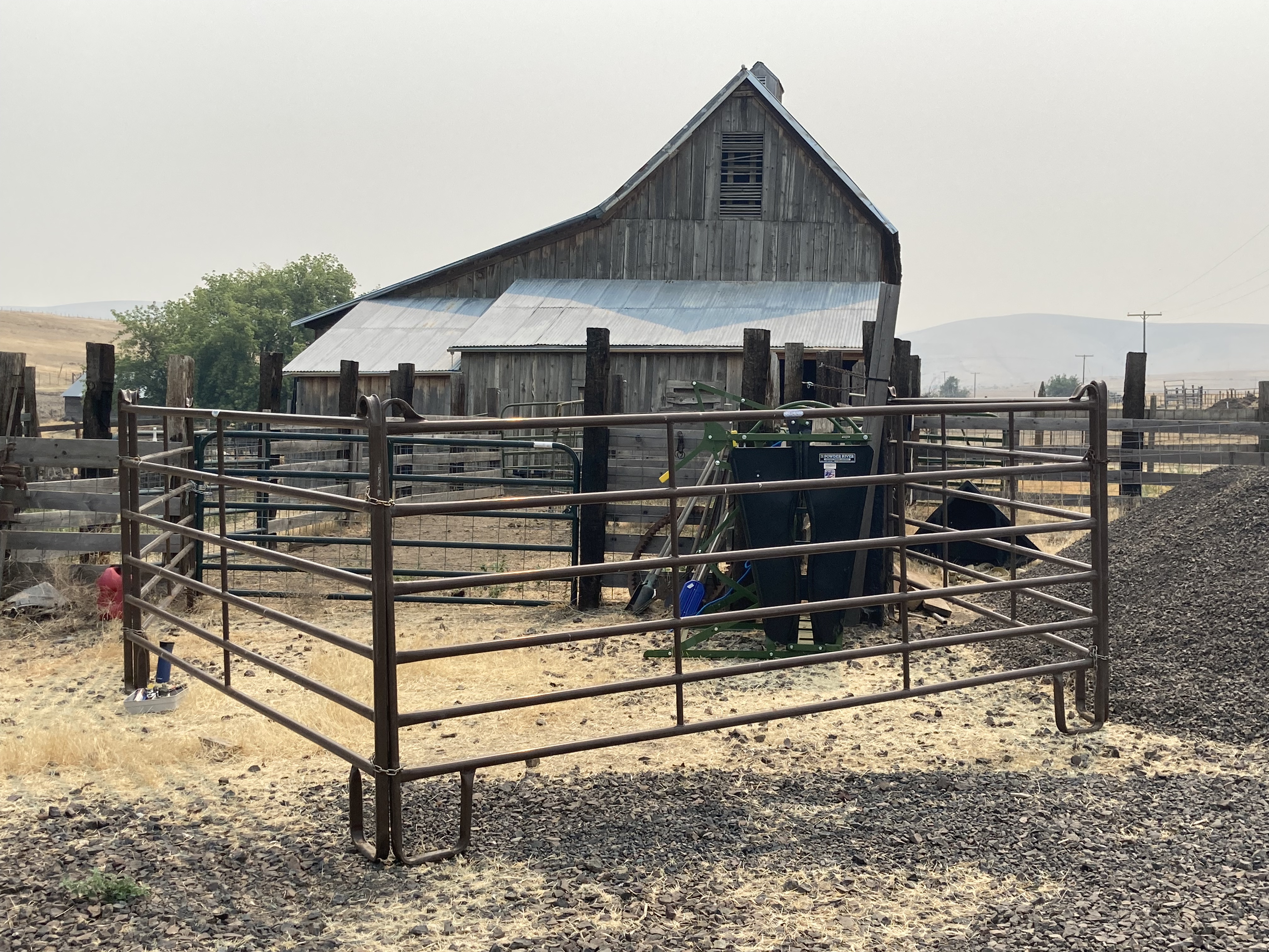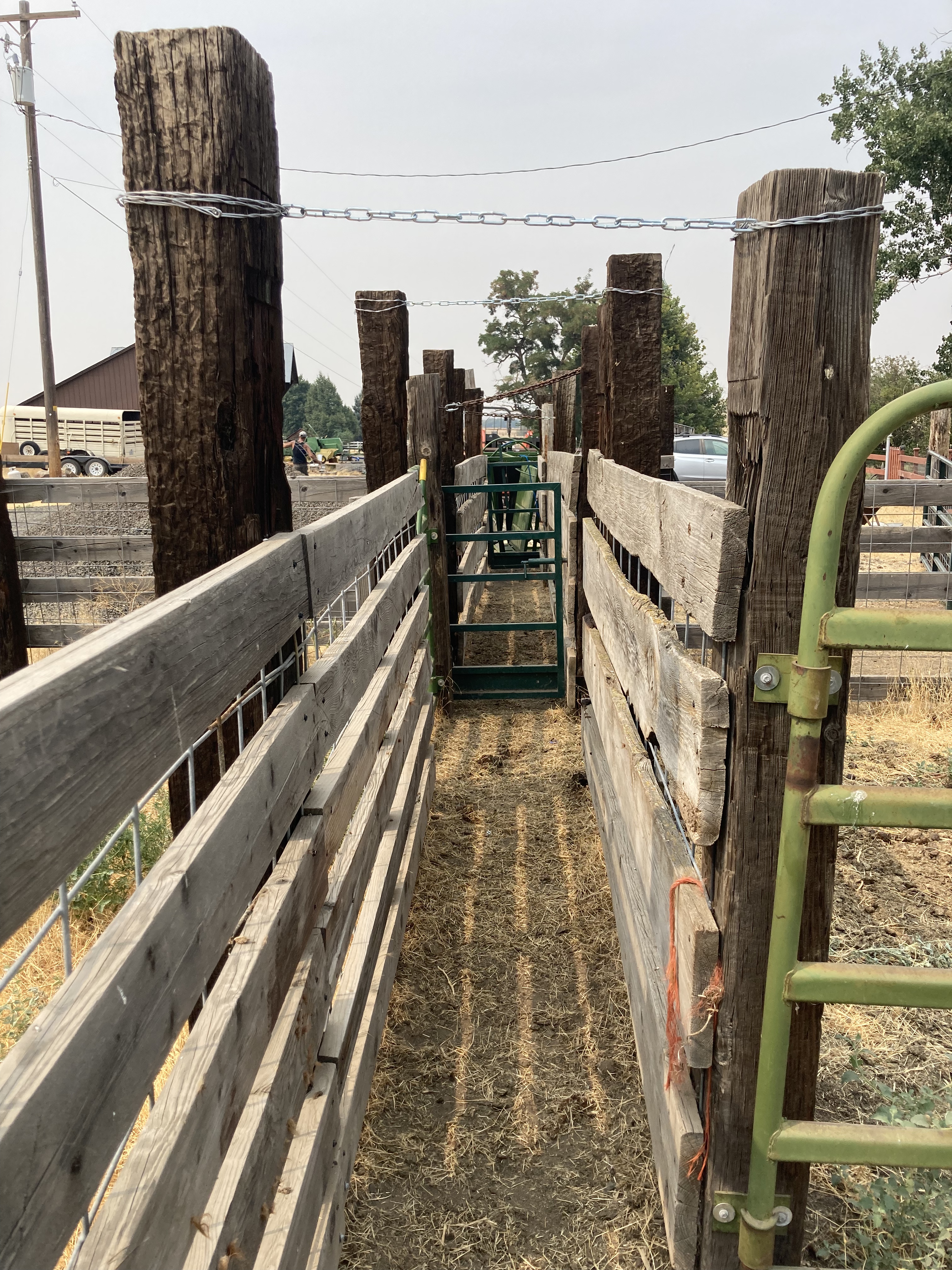 I get up bright and early so I can be in Lagrande by 0730. Annmarie comes out to help me, the first four just go right into our livestock trailer. I try and run the bull through the chute but he keeps dragging his horns and having to turn his head. He is 13 or 14 years old and has a very large head and decent horns. So we let him back into the corral and Annmarie suggests just backing the trailer into the pen, opening the entire back and getting him to just walk into it by himself. We do this and he is coaxed in under five minutes. He is so calm.