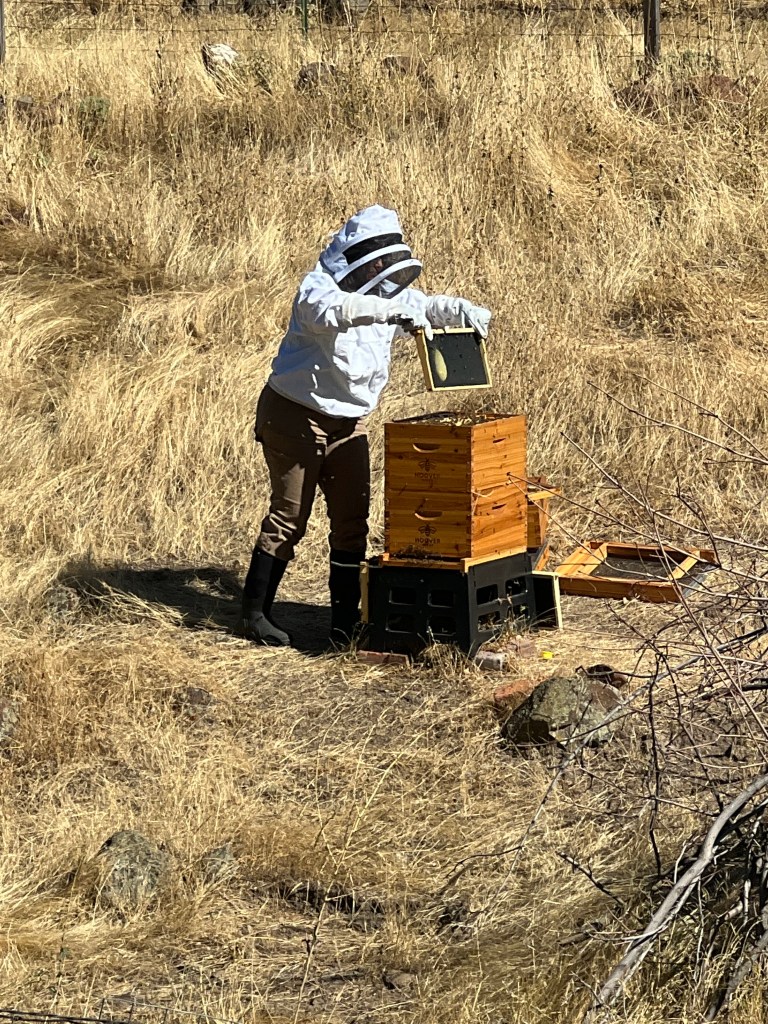 So she suited up and went out to inspect the hive. The hardest part of beekeeping is in figuring out how to keep the smoker lit with smoke and not flames! So after fussing with it for a while we managed to get it going. We lifted the hive boxes up onto the stand. This helps keep the insects away from the hive. I helped but I told Annmarie I had to be in the back of the hive as I did not have a bee suit on. We are getting pretty comfortable but I am not that comfortable that I want to be on the entrance side bending down to lift the hive boxes! Maybe eventually we can do all the bee care with no protective gear but I am not sure that will ever happen. Annmarie has been reading and now just uses nitrile gloves so she can have better dexterity when working the bees. So far this works great, she says she can feel the bees bouncing off the gloves but she has not been stung through them yet. I have not reached this level of comfort yet. She scrapped the lid clean but the lower boxes had been welded together by the bees. Once she got them loose the inside frames were still stuck. She is going to have to take the entire thing apart frame by frame to get everything cleaned up and correct. We think the entire upper box is already full of honey. So this weekend she will get two supers on the bottom and then one honey box on top so we can get more honey. We get about 3/4 pint from each frame. The one thing we have found out that we did not anticipate is how much beeswax is being produced. We don’t have a ton of it yet but we are close to having a pound of it already. That doesn’t sound like much but it way more than I anticipated. She peeked at the second hive but that one has the young queen and she is not as proliferate as the old queen. She needs to be a better leader!