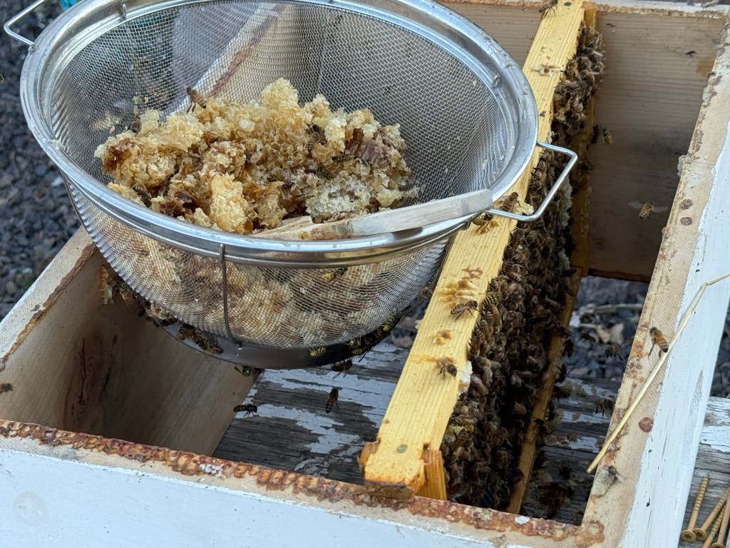 Annmarie made some bee food and I took it out today. I listened at the box and could not hear any bees, I also could not see any bees. I popped the feeder lid off, we have an extra box on top that houses two 1/2 gallon feeders that they can come up into from inside the hive. I had to pop the lid off and there were no bees. In their defense there was no food either, they had emptied both feeders. I did knock on the box once also. By the time I got done changing out both feeders I could see the bees around the outside entrance. They were kinda milling around without any real purpose. I even saw one fly for a couple of feet before going back to the hive.