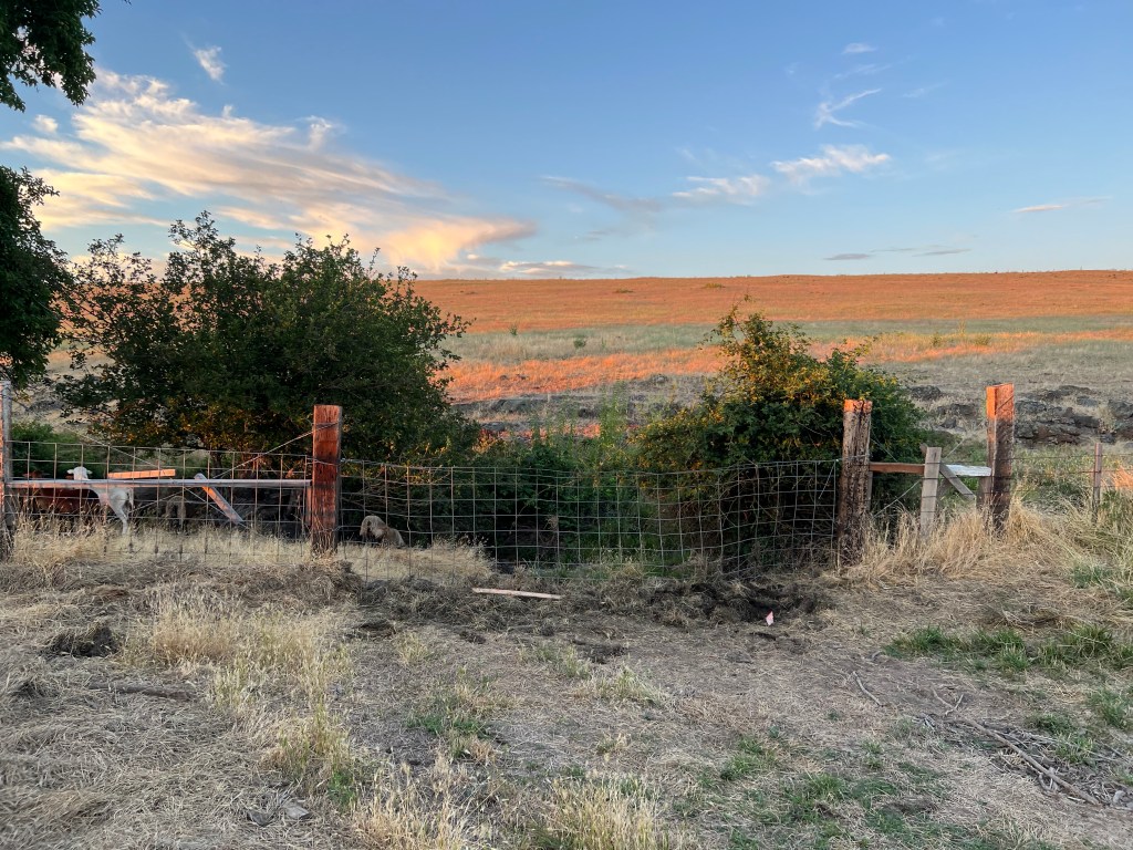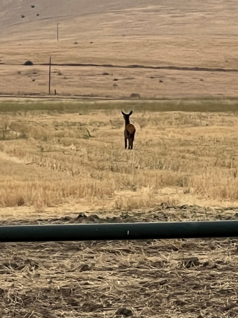 I went out one morning to feed the horse and she would not eat! This is so odd that I stopped doing and looked around to figure out what the horse was doing as she was not at the pile I had just placed outside the barn. She kept staring out into the area behind the grain bins. I walked over to her, pet on her and started to scan the area myself and spotted it, a calf elk was stuck behind the fence. It kept running alongside the fence line looking for a way back out into the wheat field. I walked around and opened up the gate and allowed the calf to run out into the stubble field. I figured it had just wandered down and would wander back up into the mountains.