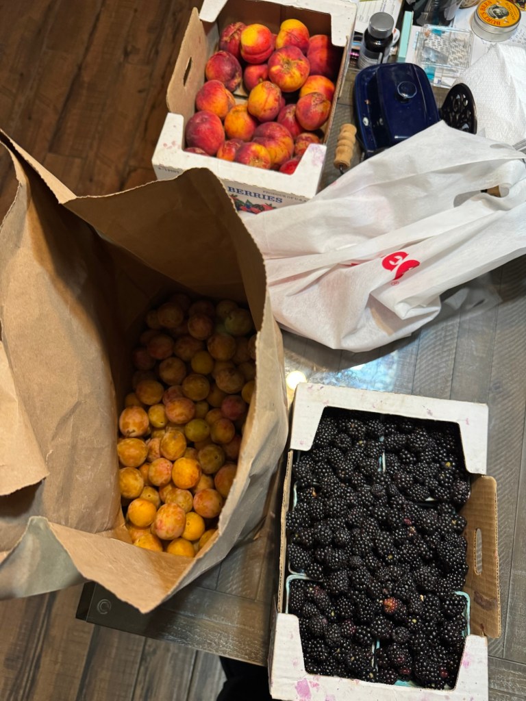 I spent one single day doing nothing but picking fruit. I picked 24 cups of tame blackberries then about 8# of plums and then nectarines. The bad part about picking the fruit is when you pick that much you have to do something with it. Our large upright freezer is stuffed full of frozen fruit. I truly believe we have enough to get through the next year. Irregardless of that the fruit trees just keep producing. I have taken boxes of plums and nectarines to work for the produce table in an effort to give it away. So far it disappears fast enough that it doesn’t go bad. I kept track of how many blackberries I have picked in the last six weeks, 21.5 gallons! That is a personal best. Annmarie has made jam and syrup that we have canned. So we have canning supplies all over the house as we process fruit. Making your own food does take time.