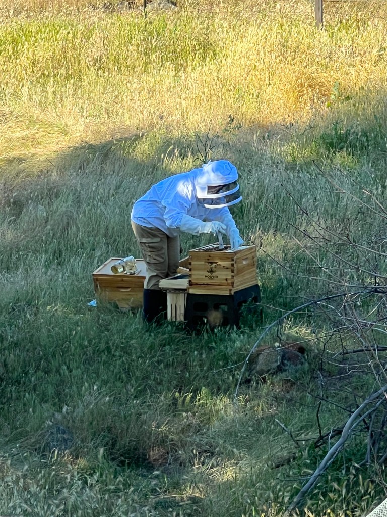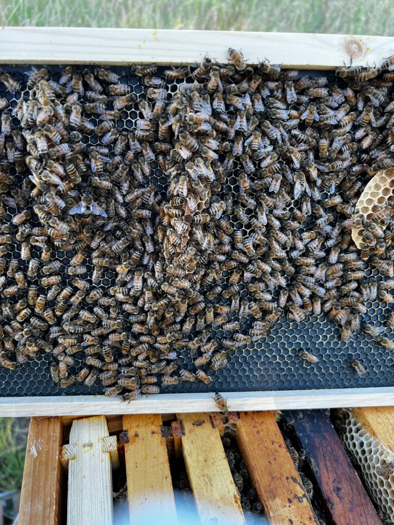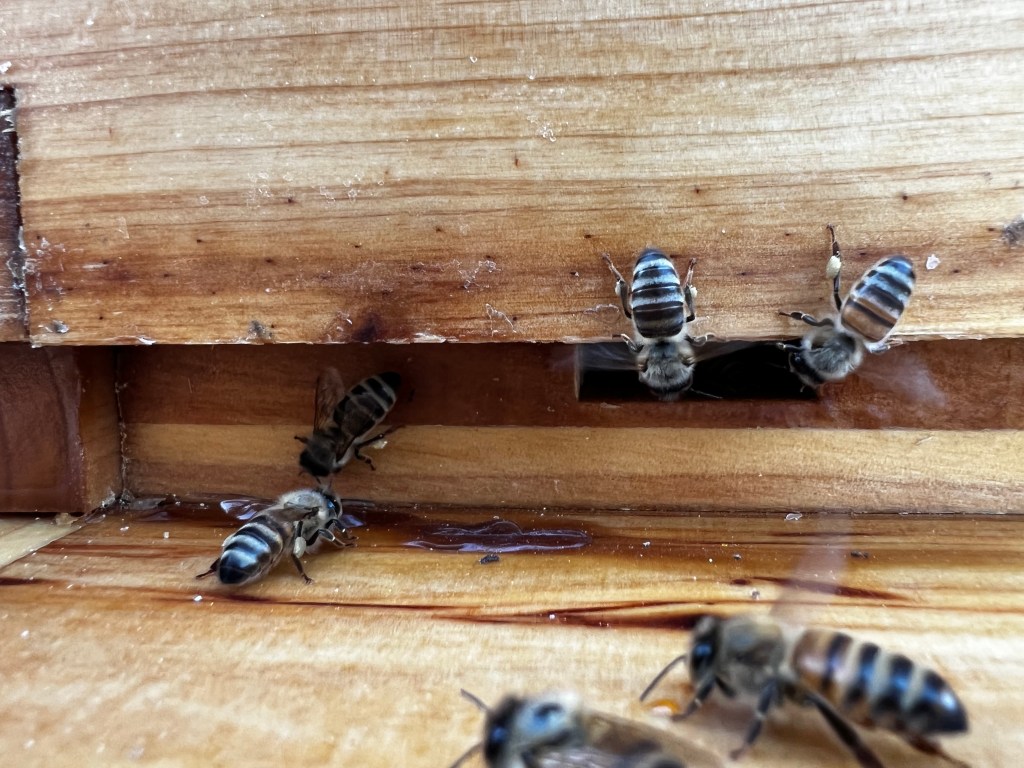 Annmarie went out to see if the bees survived. They were all still alive but very mad. She had to put the two halves on separate boards and let them sit for 24 hours then went back out to put the hive back together. The sugar water we had given them had crystallized so she diluted it out a bit and put the feeder back on top. I strapped them all together and added a second strap. So now the hive is attached to the fence at three spots and should not blow over again. I think I can fix this in the spring by pounding in three pecker poles around the hive so it cannot blow over. I need to leave about two inches clearance on each side and make space for a second hive to be installed. She ended up getting stung three times over the course of 24 hours getting them upright and fed even with bee suit on.