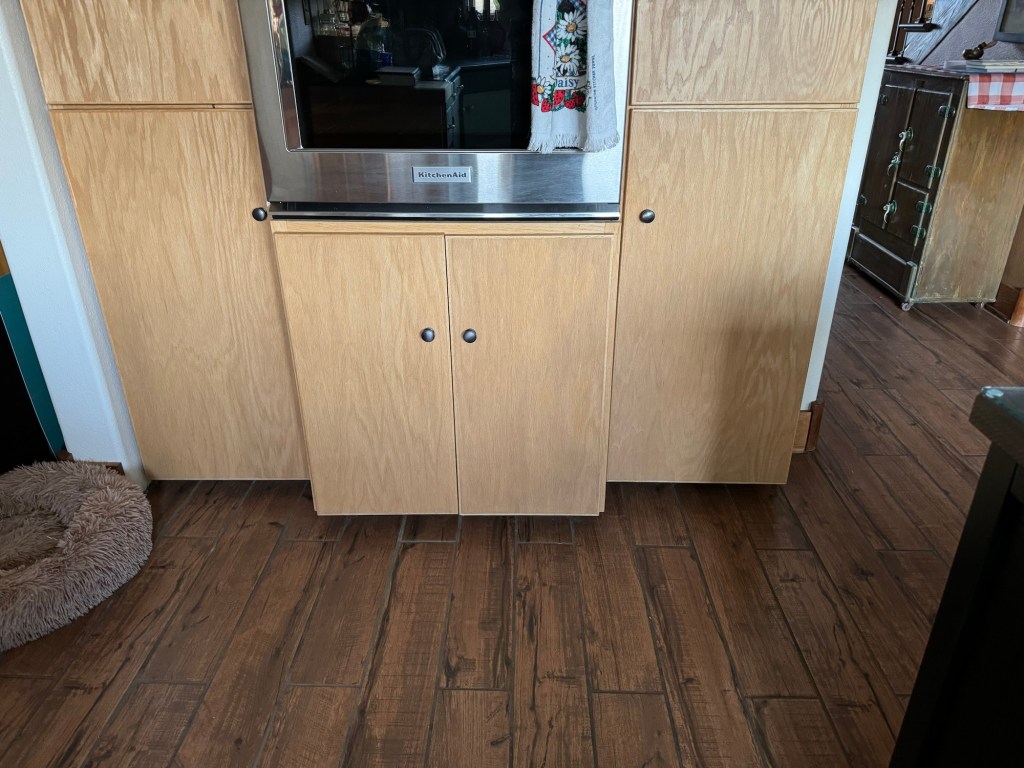 Yesterday, Mr Rainman came out and we really worked on knocking out a lot of little projects. I cut the last piece of oak kickerboard to go under the oven cabinet and we nailed/screwed all three pieces in place. This way the dog’s play toys cannot go to purgatory. I only had to fish out two toys before installing the boards. You can see from the pictures what a difference it made. The picture on the left is before I completed it and the one on the right is after they are all installed.