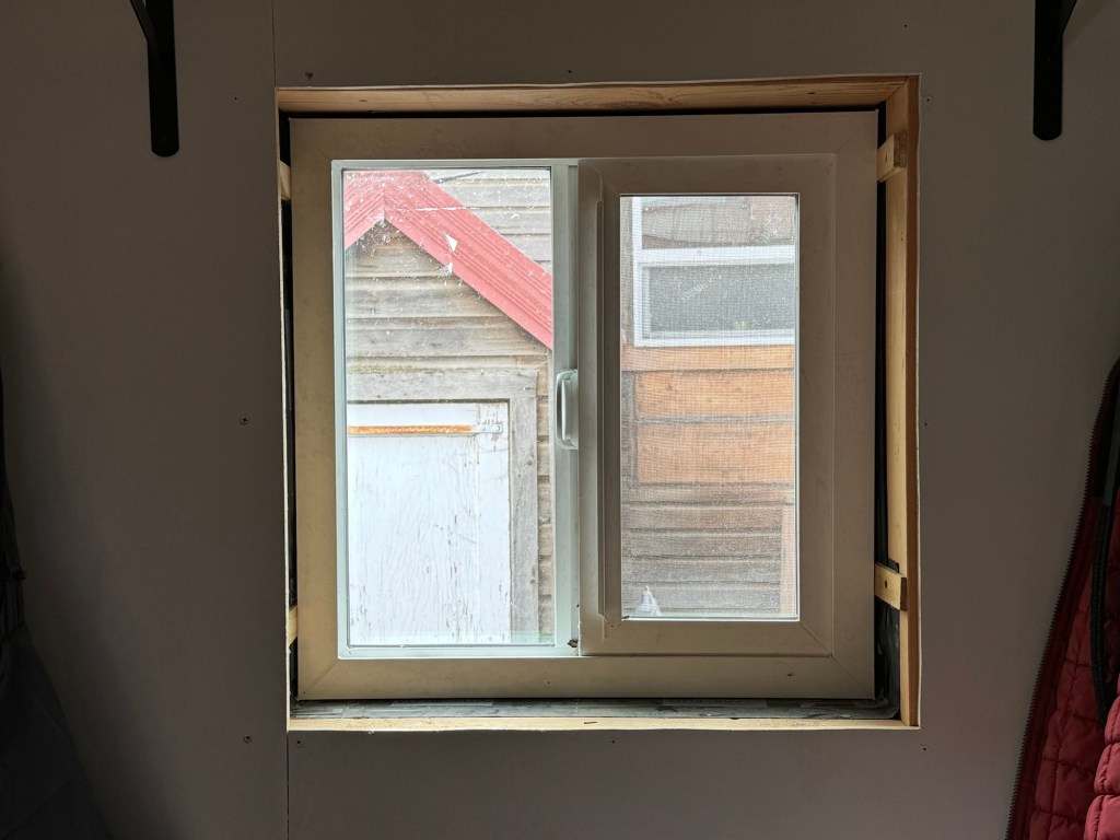 We had to bring the table saw around to the front of the old house so that the window trim in the mud room could be finished. I needed to cut a custom width on the inside of the window. Luckily, we were able to find four pieces of scrap that were wide enough to work. I trimmed off the joint sides and kept the middle. I had to shim the window trim quite a bit to get it to fit correctly. The outside trim was just an intact 1×4 that we cut to size and sanded down. I will rub finish into all of this trim tomorrow when I get the trim in the kitchen. The pneumatic nailer and compressor had to be brought over. I am missing my 18g midsize nailer. We have looked everywhere for it but I do not really want to buy a DeWalt trim nailer to replace it, those things are expensive. So we made do with a larger finish nail.