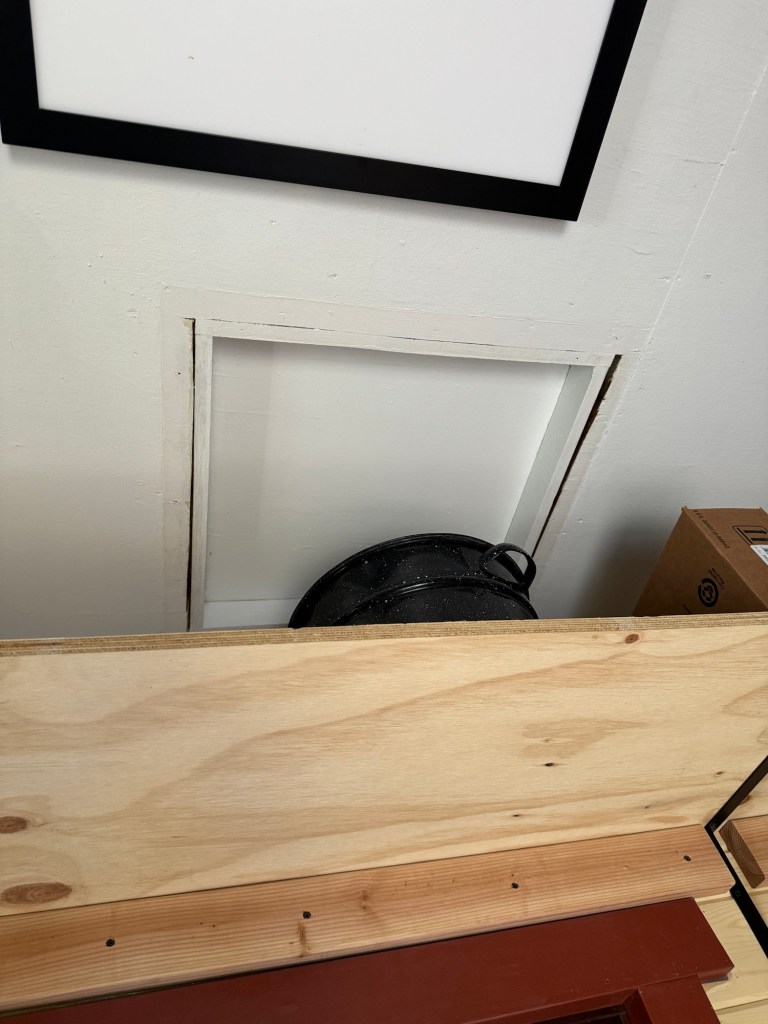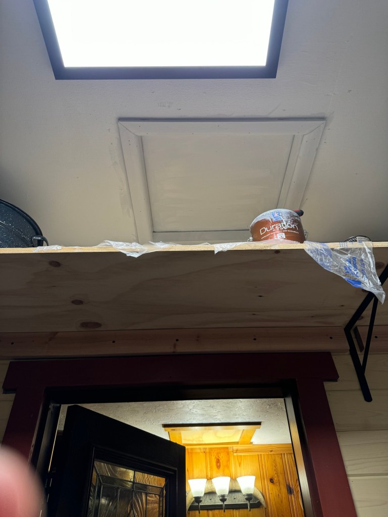 The mud room does have an attic enclosure. I was up there when we first moved into the house as I had to run wire for house power through it. We sealed up the gaps and then installed the old trim back up. Due to adding a wall we ended up having to leave off the back board. I painted it all today after the caulk had time to dry. I am not sure we got the right white paint can correct. When it was wet the paint looked a little off. I won’t know until it dries and if it is really noticeable there is enough leftover paint to repaint the entire ceiling so it will all match.