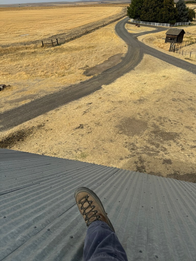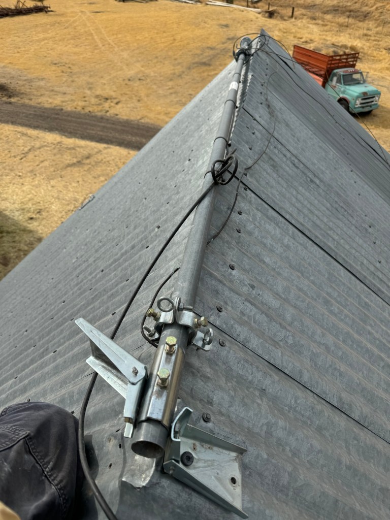 Friday the last of the oversized roofing screws came in. So on Saturday I got back onto the machine shed roof to finish screwing in the roof ridge. It only took about five minutes to complete but before I could get down I wanted to remove the antenna pole that had been on top of the machine shed. Another thing I should have used the boom truck for along with the ridge line installation. So instead I just crawled up onto the hay room roof ridge and scooted over to the pole. I was able to unscrew five of the six anchors. I had used one off brand type with a weird star shaped pattern. I stayed on the roof and Mr Rainman went to get bits and then put it in a leather glove finger held in place with a rock jammed into the finger. He then tossed it up onto the roof at me. I could not move at all so the throw practically had to hit me for me to catch it. There was much cajoling and when that did not encourage him to throw harder some name calling may have been utilized. He could not find the correct head type so he had to throw me up two 1/2” open end wrenches so I could unbolt the pole from that half of the roof anchor. We ended up having to move the ladder, cut the grounding wire holding it up then move the ladder again and unhook one of the anchors. It came down finally. All the usable parts were removed and salvaged for later potential use and the rest tossed onto the metal scrap heap. That has been up on the machine shed roof since 2017!