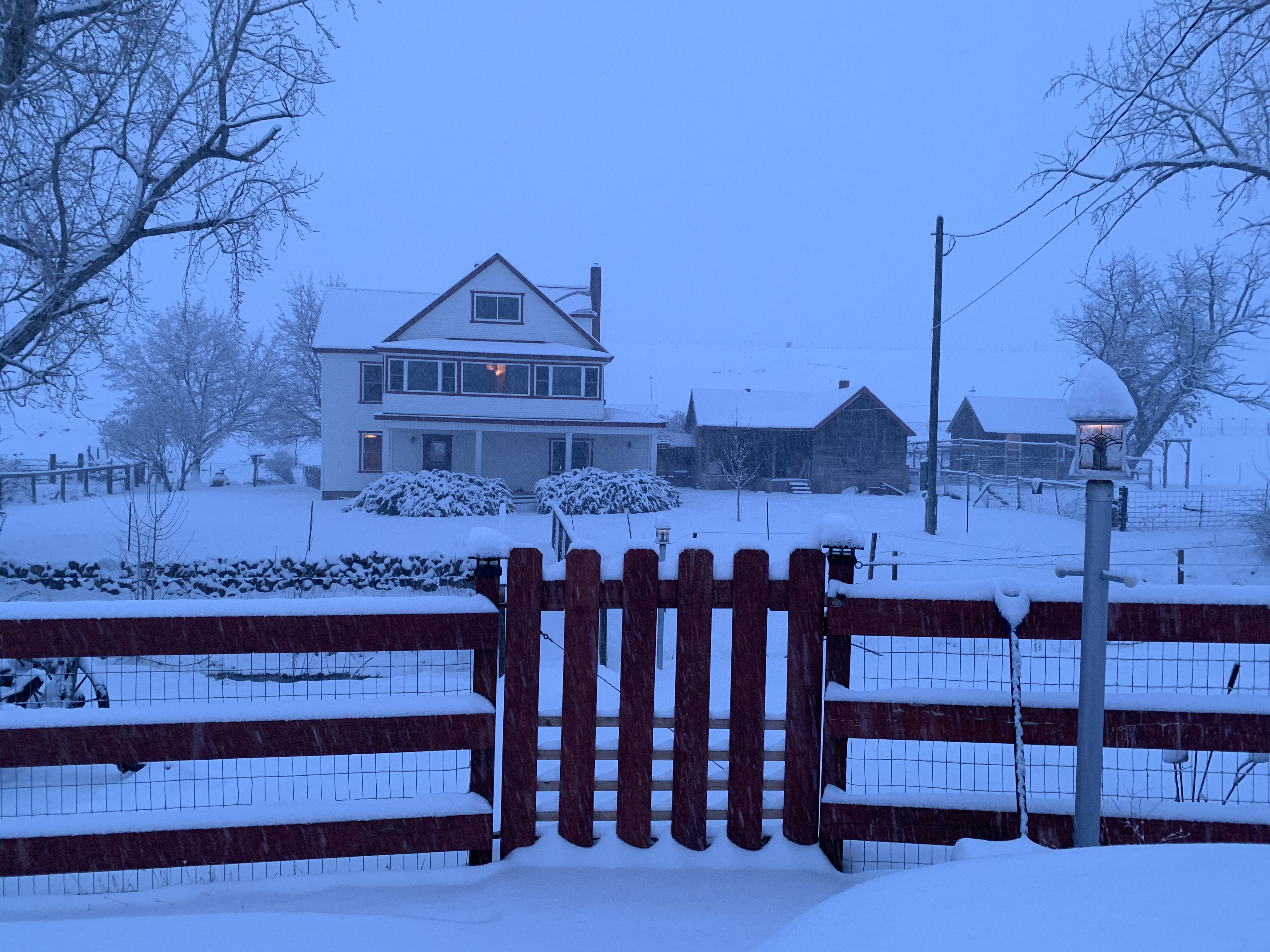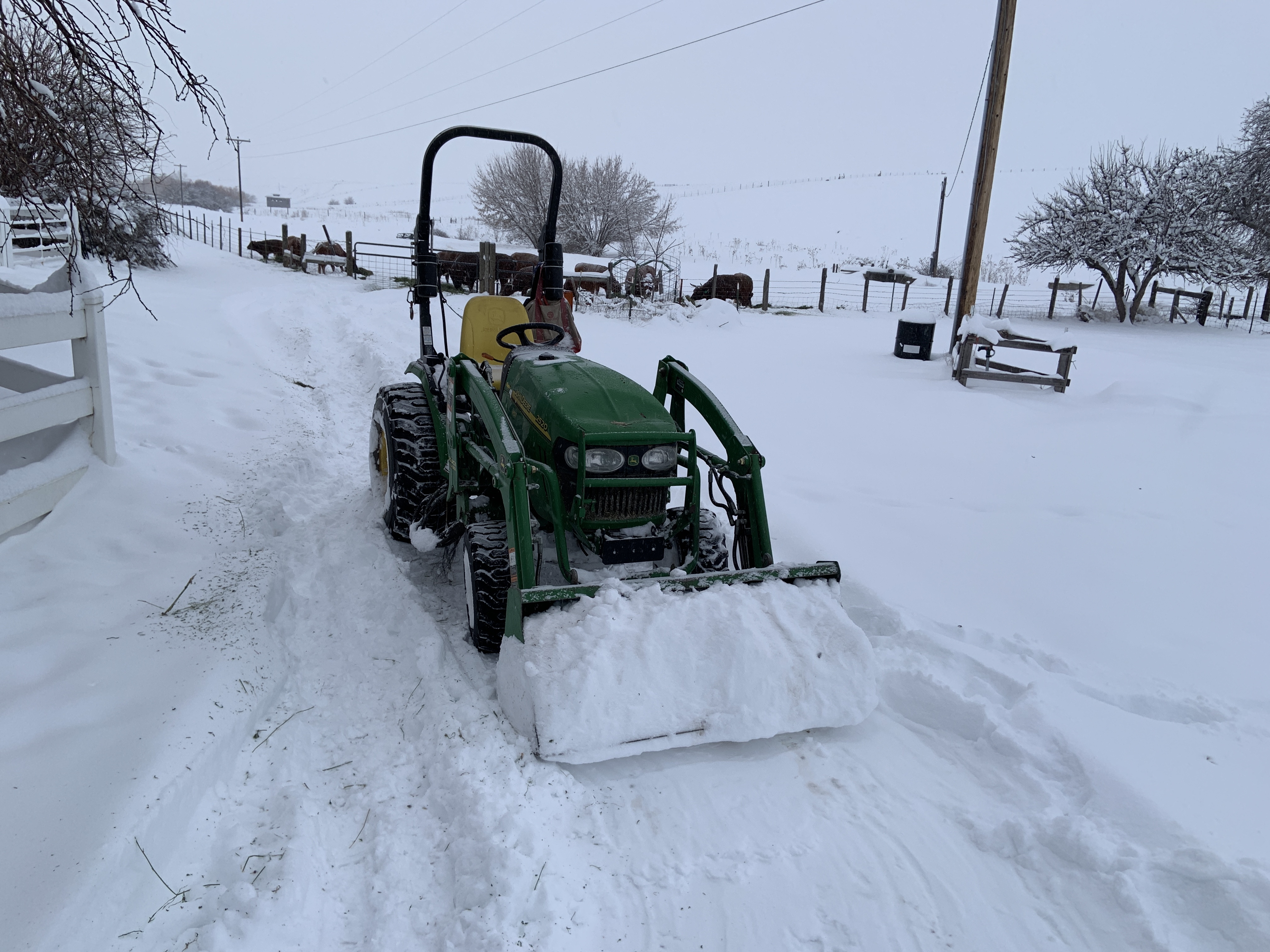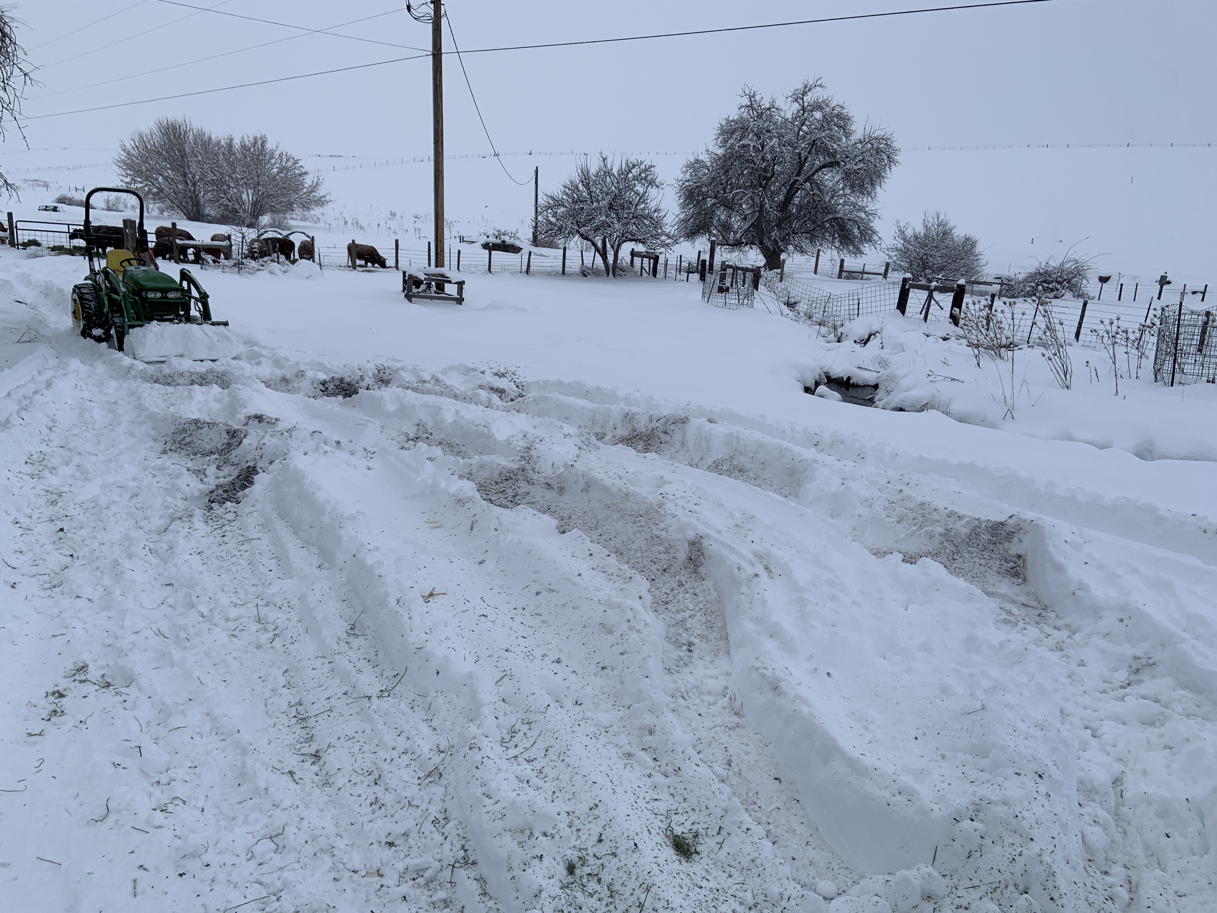 On Monday I was trying to clear another 6 inches and got the tractor stuck down by the cow gate. Annmarie had already had to pull me out with the pickup once 30 minutes earlier. So I called her again and she tried to get me out to no avail. She almost got the pickup stuck and had to apply a judicious amount of gas pedal to get it to clear out of its predicament. I tried to call the Tractor dealer to get them to come pick it up for repair but the phone was busy all day. So now we have two vehicles stuck!