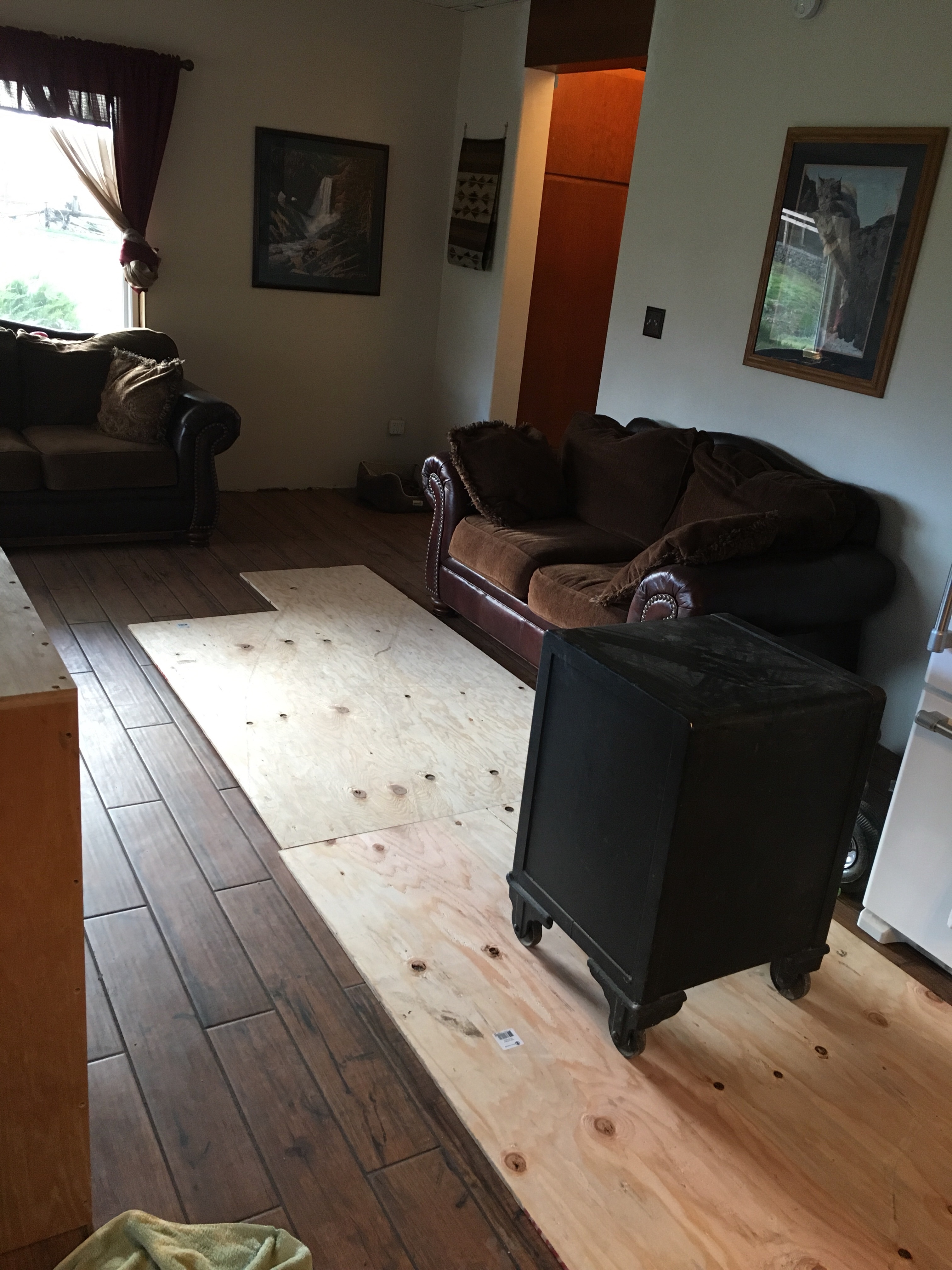 We had to move the safe! This thing weighs over 600# and has steel wheels. We were afraid it would chip the tiles. I went out and cut some wooden coasters for the safe to sit on out of some dry maple wood I had out in the shed. Annmarie had some felt in the craft room that I cut and glued to the bottom of the coasters. We laid down plywood and managed to get it over to its final resting spot. I cut little boards to go between the coasters to allow us to push it onto the coasters. It worked surprisingly well. Now if someone would just open it up and tell us the combination. I am upping the reward to $200! The safe cannot be damaged in any way doing this.