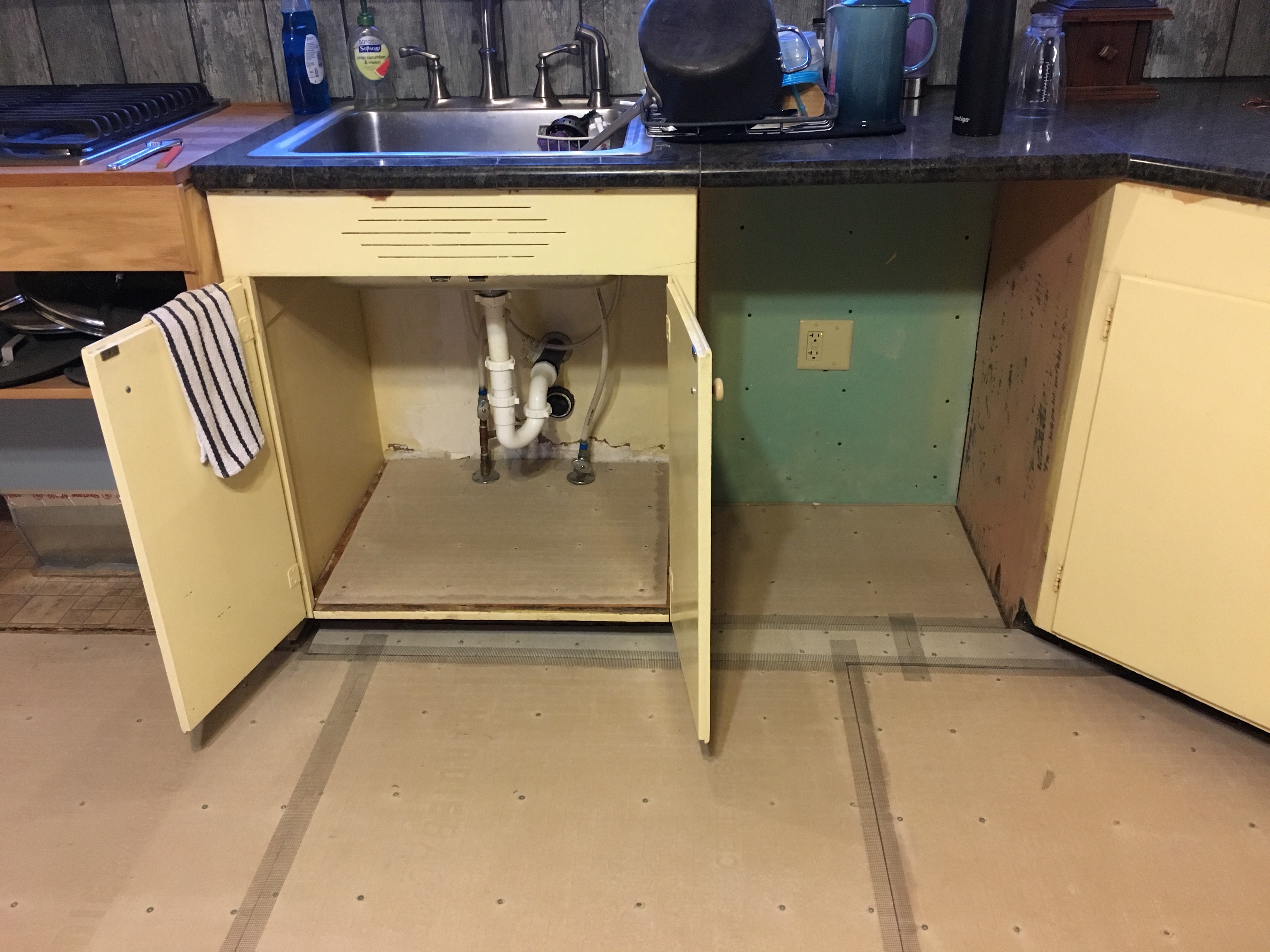 We pulled out the dishwasher so we could tile under it. Once the tile is in place we will caulk all the wall joints and floor joints. We also ground off the points from the countertop screws. They were sticking down about 1/8 inch. Everything will be smooth to make inserting the dishwasher easier. While we were doing that I decided that we needed to tile the floor of the sink enclosure. So we pulled out all the cleaning supplies and will install tile and seal it off after we get it tiled.