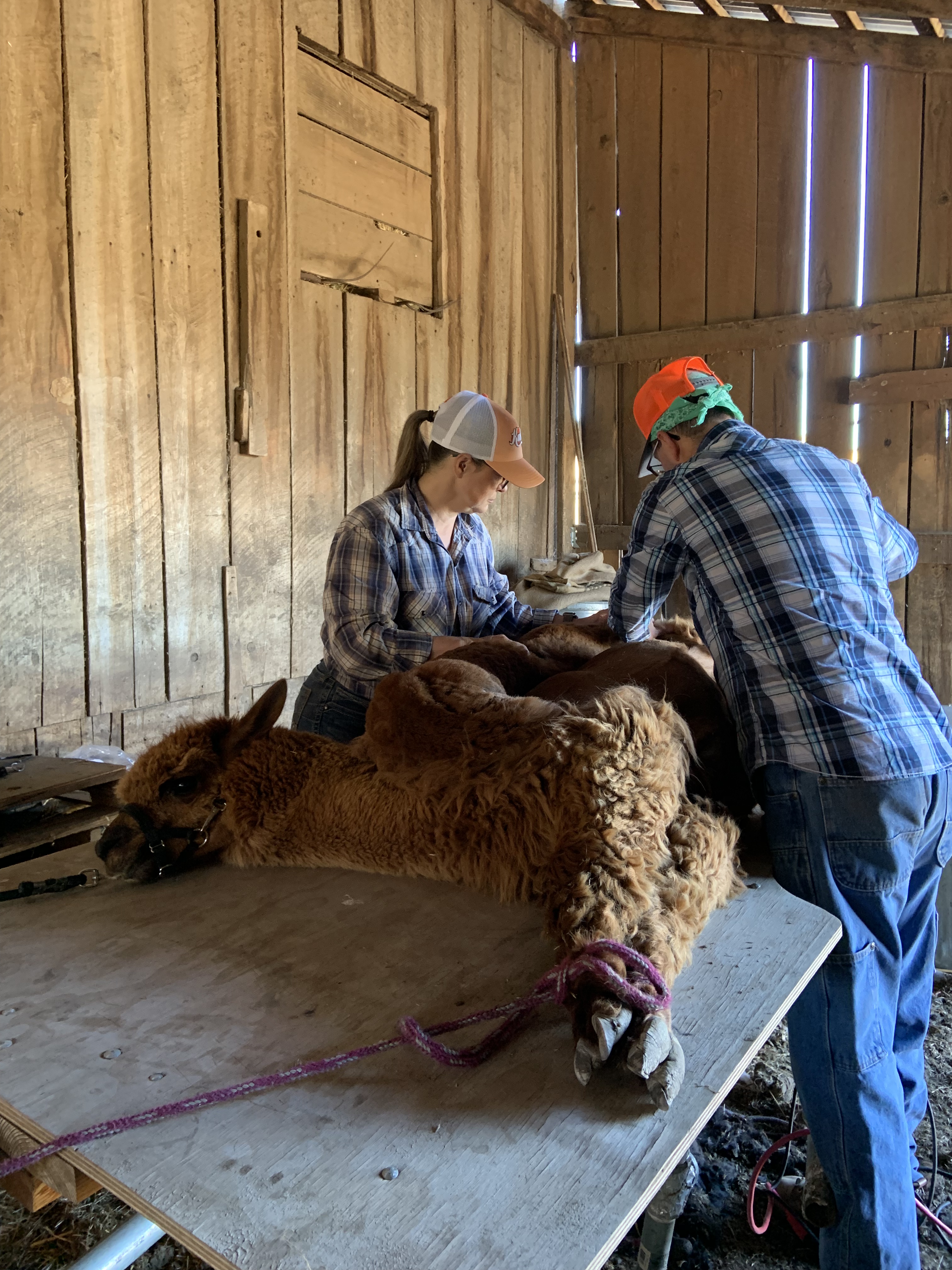 We were all getting tired and I just wanted to finish and get it over. We had two alpaca left but they would not come in yet just as we were exiting the barn they volunteered to be caught. This necessitated us just hunkering down and getting it done. The very last alpaca decided after we had the halter on that he was not having any of it. He reared up full height on his back legs and body slammed Sarah into the barn wall. He hit her from the side mostly due to some inattention on her part. She ended up on the ground but will only have a few bruises and we managed to get the last alpaca sheared.