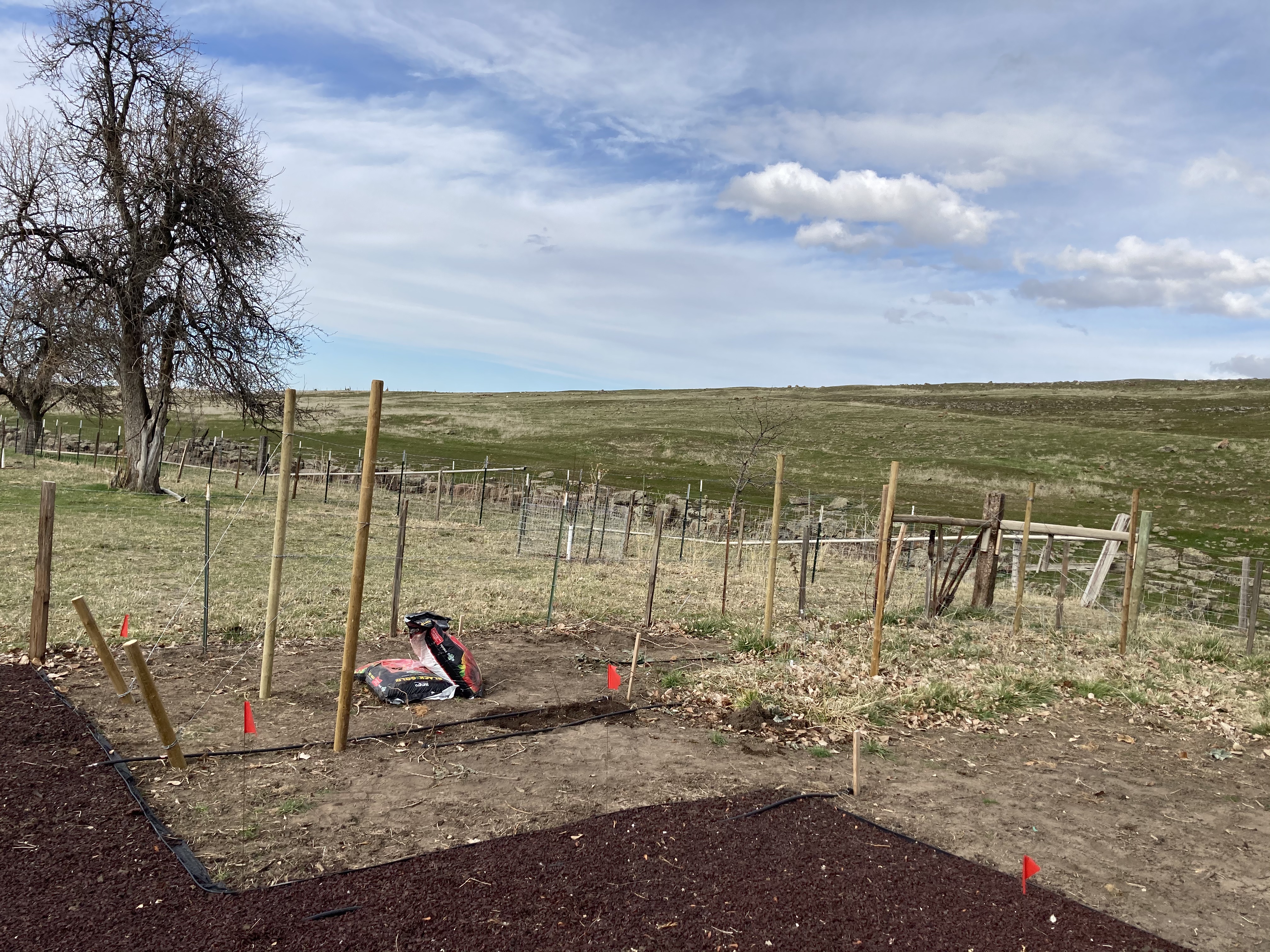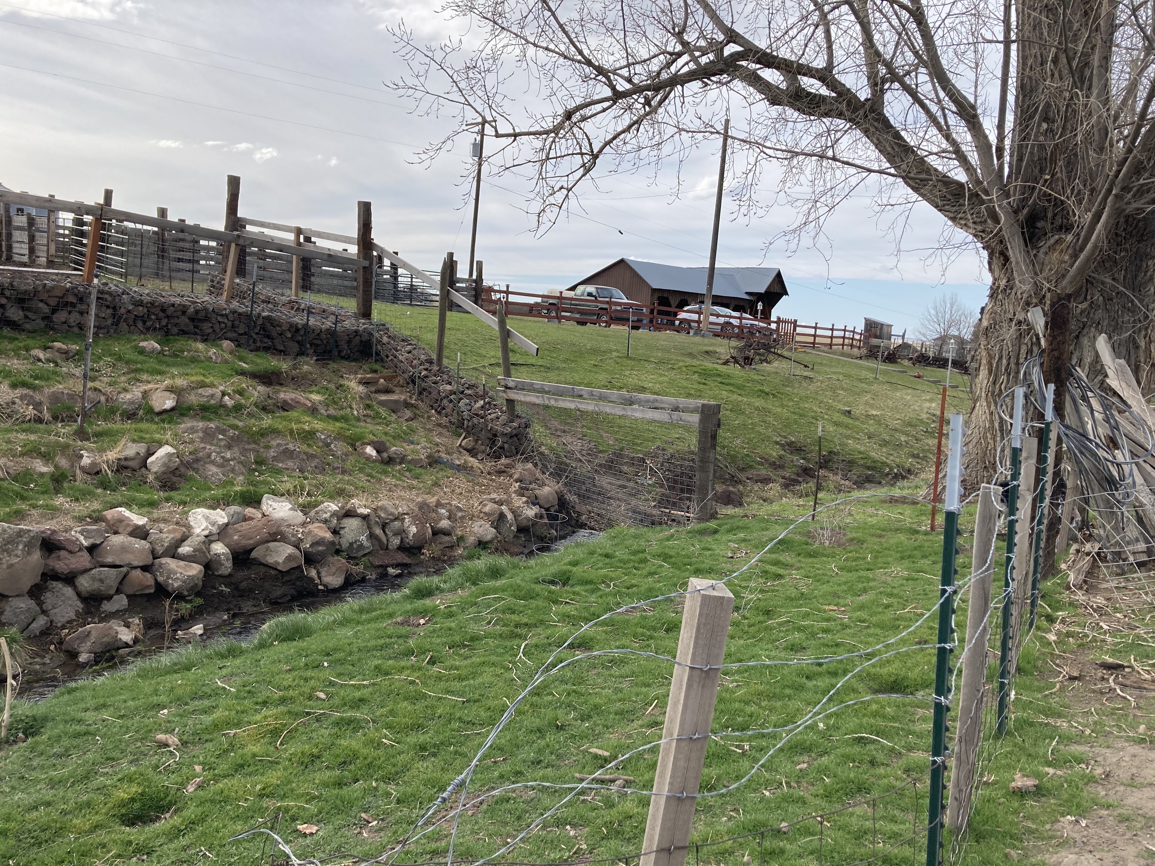 I had to run back to town to get the right size splices, the one I picked up the day before was too small. We got all of the wire up, attached and the gates hung in about four hours. The new battery powered fence stapler is the bomb!! It just slams through driving staples. We had all the wooden stays up in under ten minutes, push, hold the trigger, machine whines then slams a staple into the stay. I love using the high tension wire and tighteners now to make H-braces. It keeps them taut and if they get loose at all they are incredibly easy to tighten. Which is not true when you use wooden stays and smooth wire twisted together.